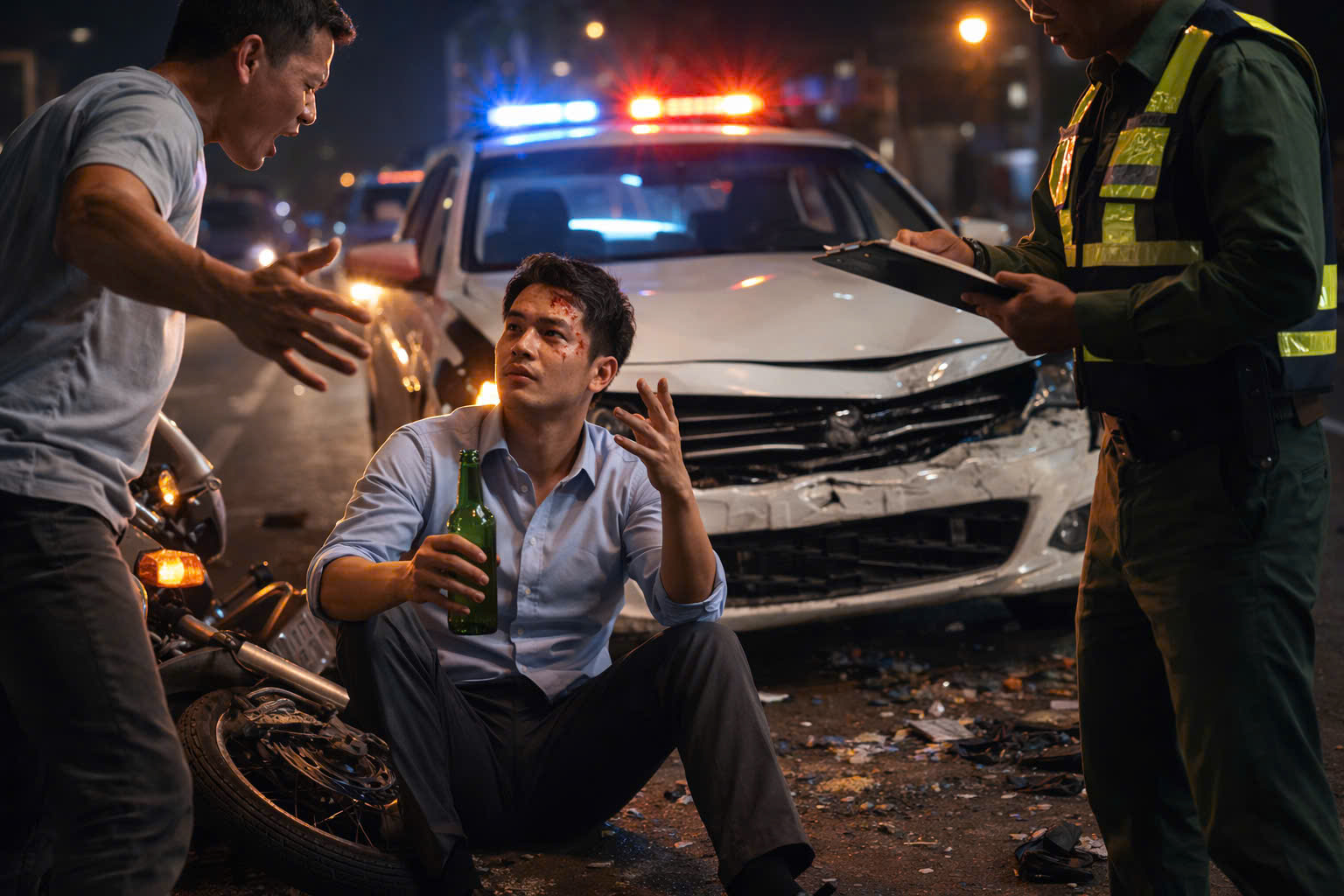 Trên đường đi làm về, tôi xảy ra va chạm giao thông với một người đàn ông đi xe máy, người này đã uống rượu bia. Vụ va chạm khiến người đàn ông bị gãy chân, phải nhập viện điều trị. Người nhà nạn nhân yêu cầu tôi phải chịu hoàn toàn chi phí điều trị và bồi thường thiệt hại 30 triệu cho người đàn ông.