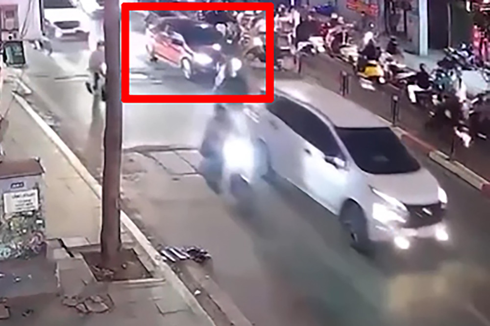 Ô tô con màu đỏ đâm vào một xe máy đang quay đầu sang đường. Ảnh chụp màn hình