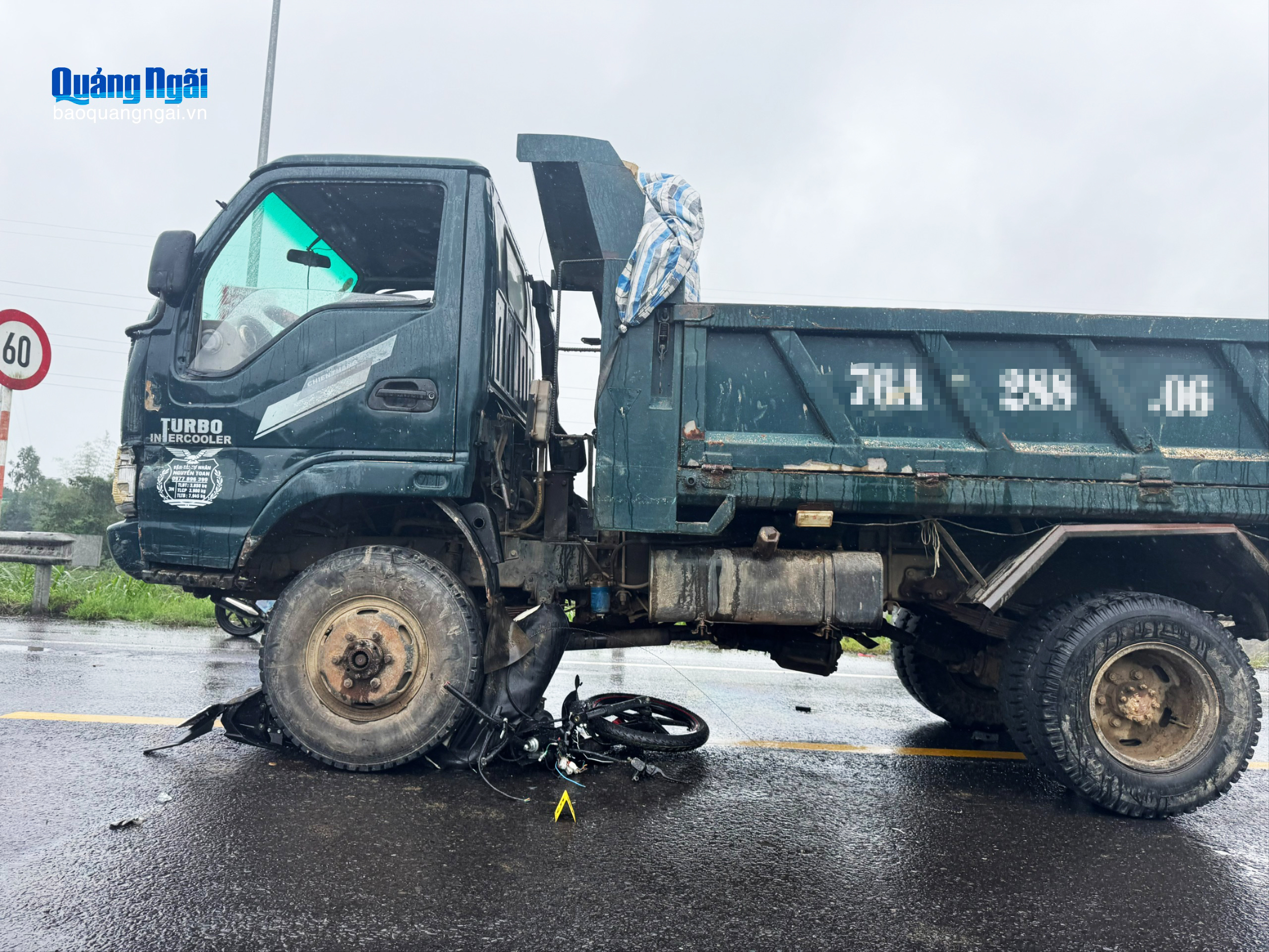 Tại hiện trường, thi thể một trong 2 nạn nhân mắc kẹt dưới gầm xe tải 29H - 815.XX. Chiếc xe máy của các nạn nhân bị kéo lê khoảng 5m so với vị trí xảy ra tai nạn và nằm dưới gầm xe tải 76A - 288.XX.
