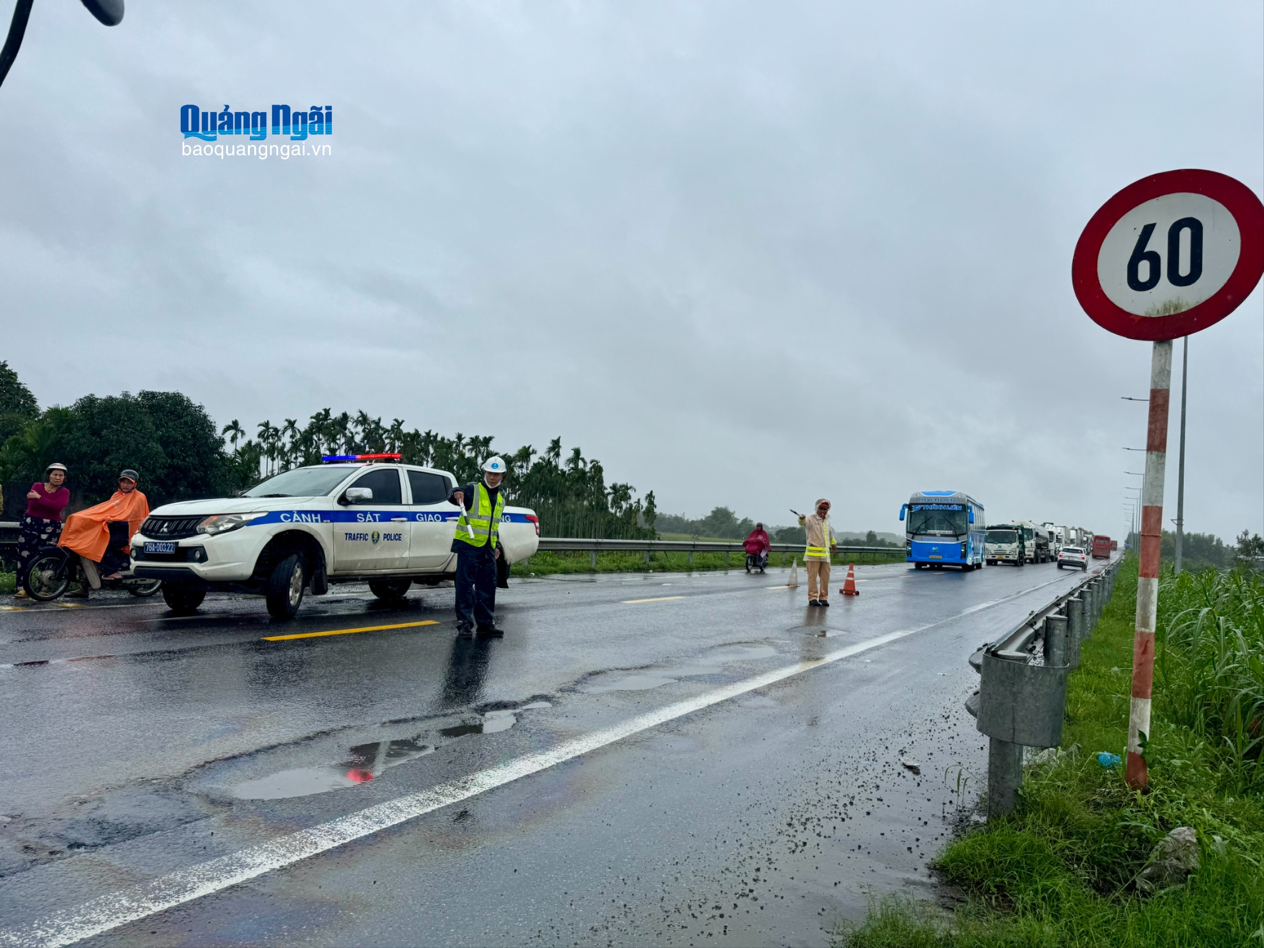 Lực lượng chức năng phân luồng giao thông trên đường dẫn cao tốc Đà Nẵng - Quảng Ngãi.