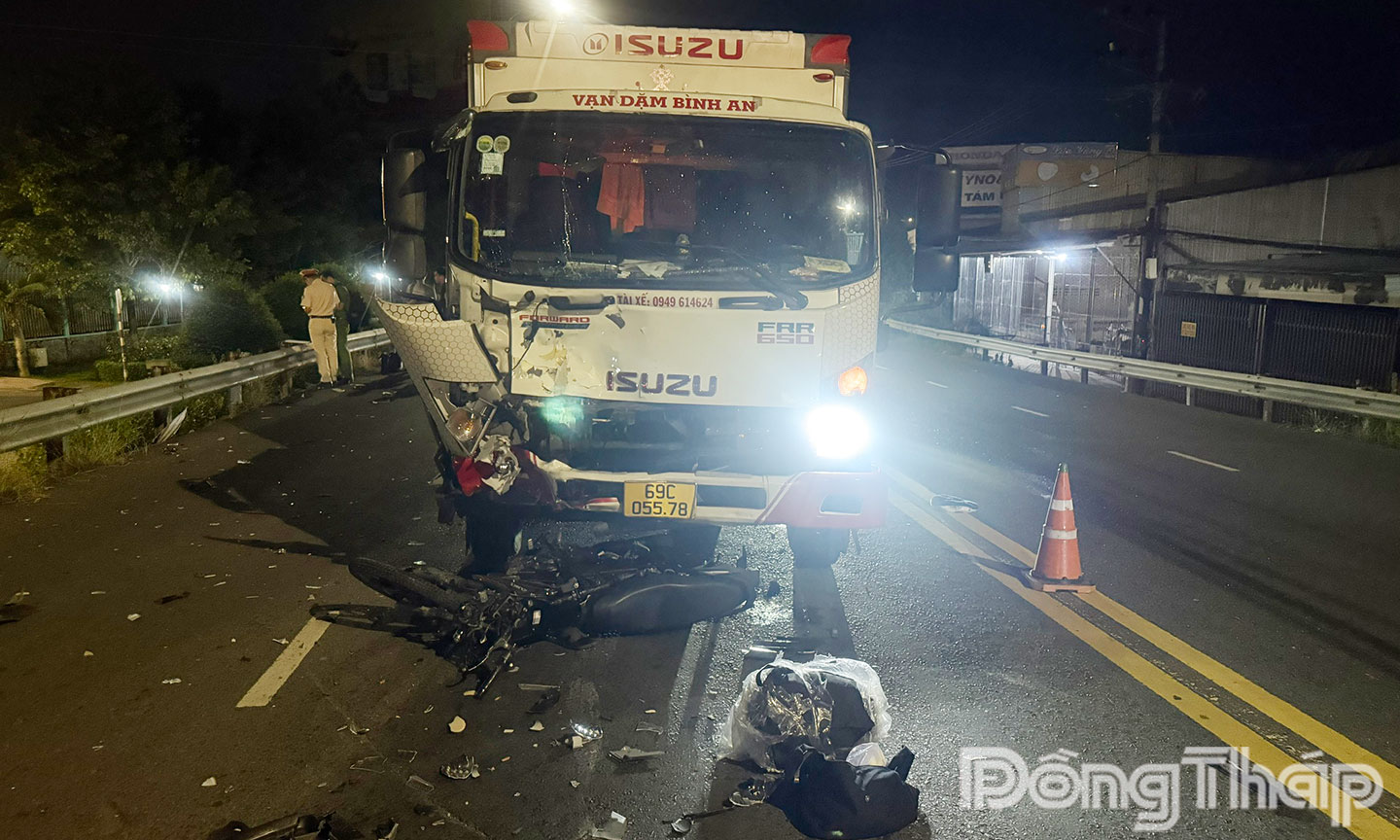 Khi đến đoạn gần dốc cầu Cai Lậy đoạn thuộc phường Thanh Hòa, tỉnh Đồng Tháp thì xảy ra va chạm với xe máy do anh Lê Văn Tiến (24 tuổi, quê tỉnh Gia Lai) chở theo chị Lưu Huỳnh Phương Ngân (22 tuổi, ngụ tỉnh Cà Mau) chạy theo chiều ngược lại.