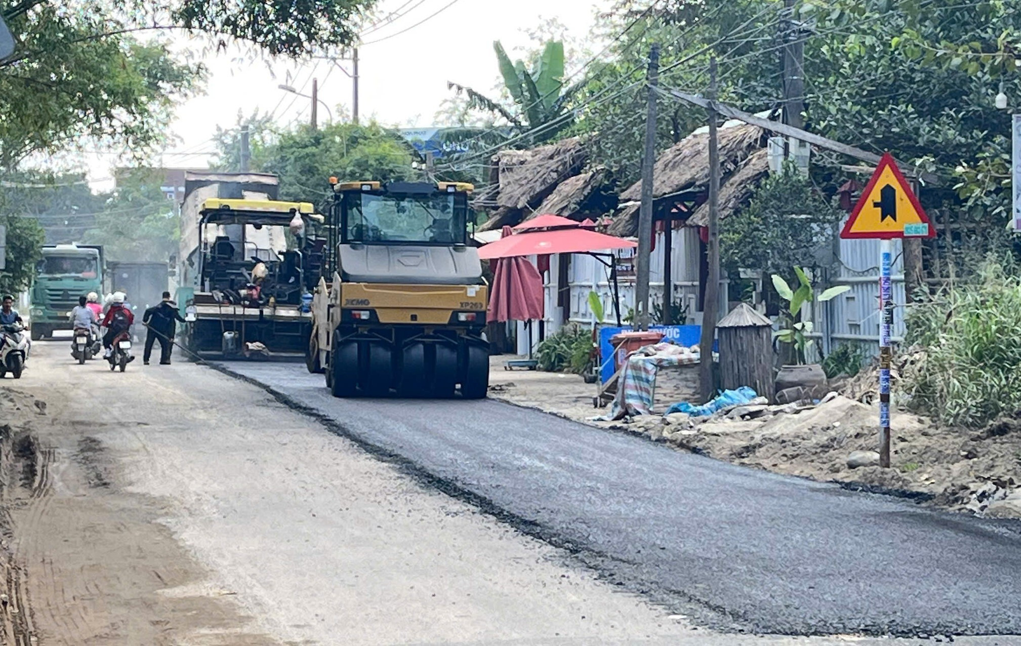 Đơn vị thi công thảm nhựa tại các điểm hư hỏng nặng. (Ảnh: M.N)