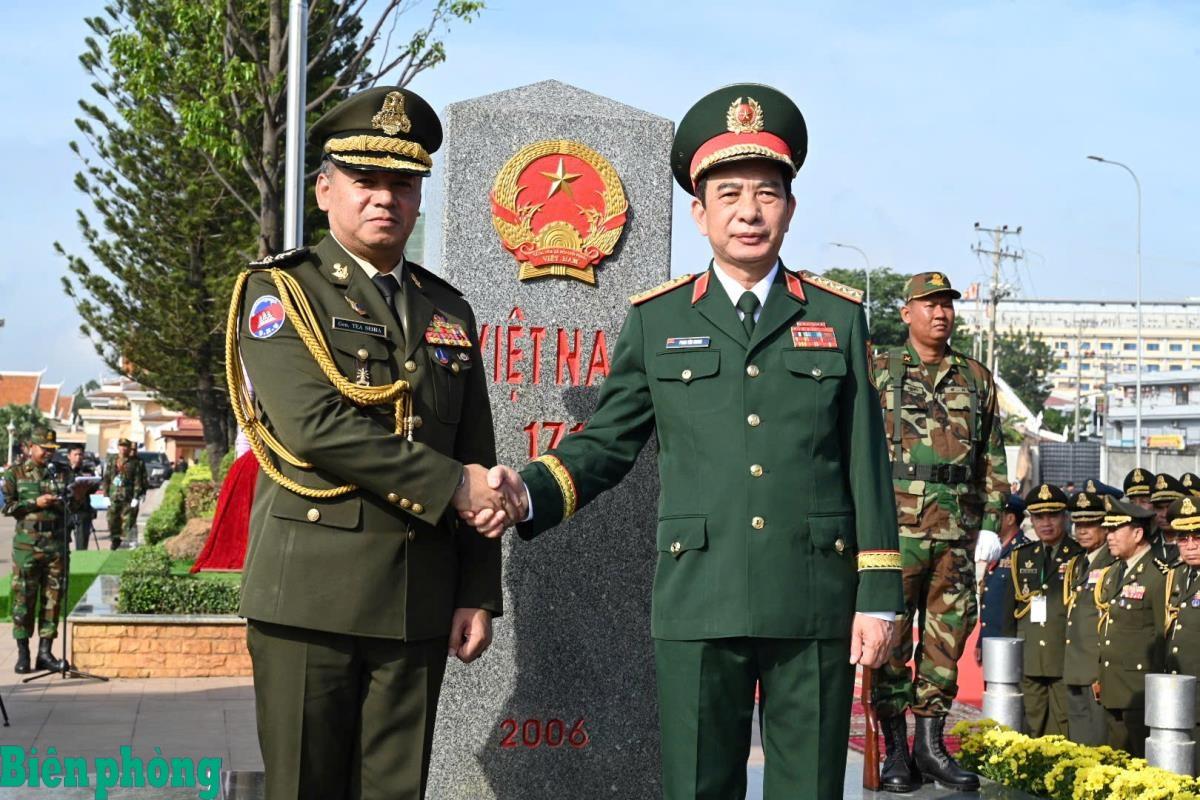Đại tướng Phan Văn Giang, Ủy viên Bộ Chính trị, Phó Bí thư Quân ủy Trung ương, Bộ trưởng Bộ Quốc phòng Việt Nam và Đại tướng Tea Seiha, Phó Thủ tướng, Bộ trưởng Bộ Quốc phòng Vương quốc Campuchia tại cột mốc biên giới - hoạt động trong khuôn khổ chương trình Giao lưu hữu nghị Quốc phòng biên giới Việt Nam-Campuchia lần thứ 2. Ảnh: Đăng Bảy