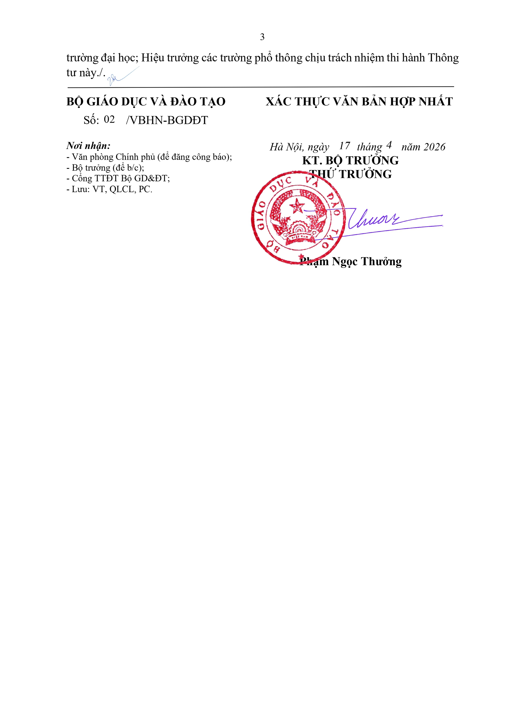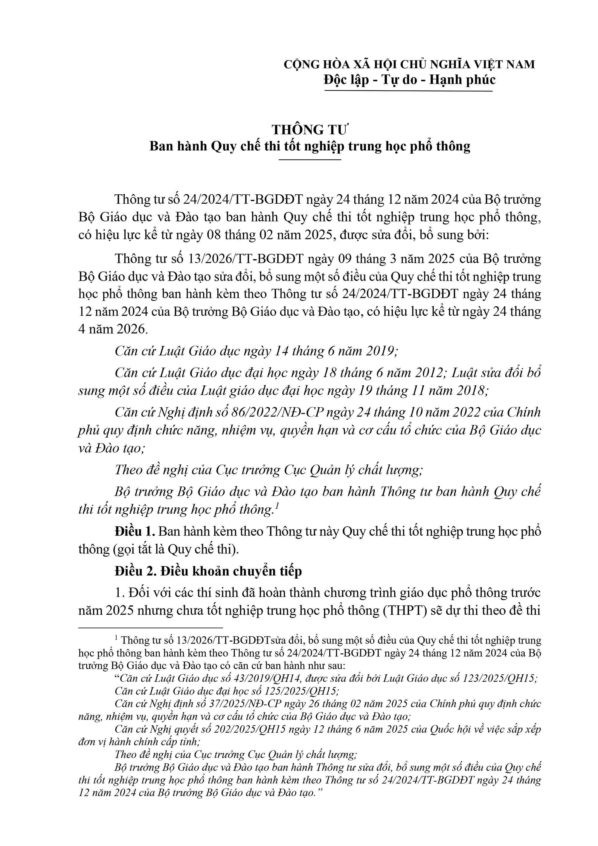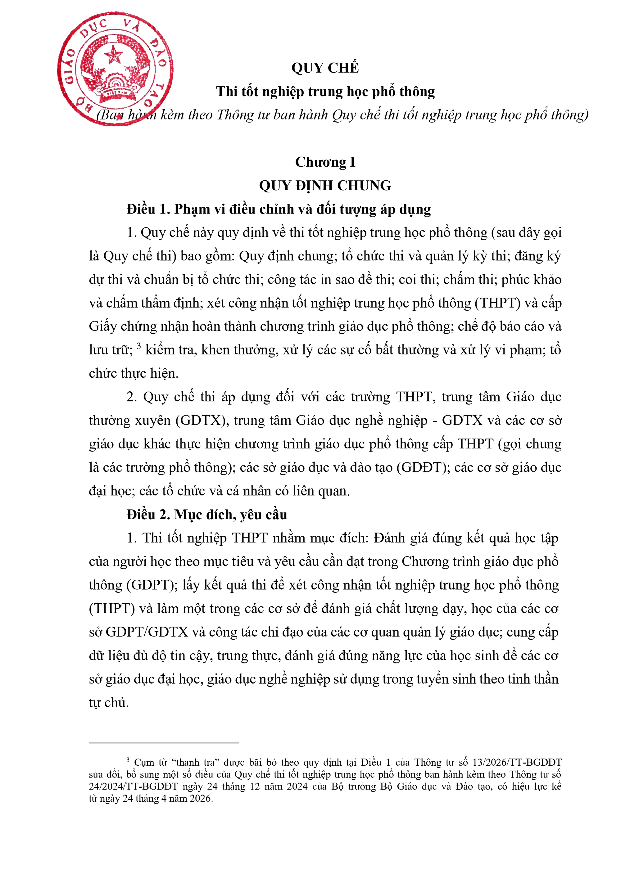 Bộ Giáo dục và Đào tạo vừa ban hành văn bản hợp nhất số 02/VBHN-BGDĐT ngày 17/04/2026 Thông tư về quy chế thi tốt nghiệp trung học phổ thông kèm theo Quy chế Thi tốt nghiệp trung học phổ thông.