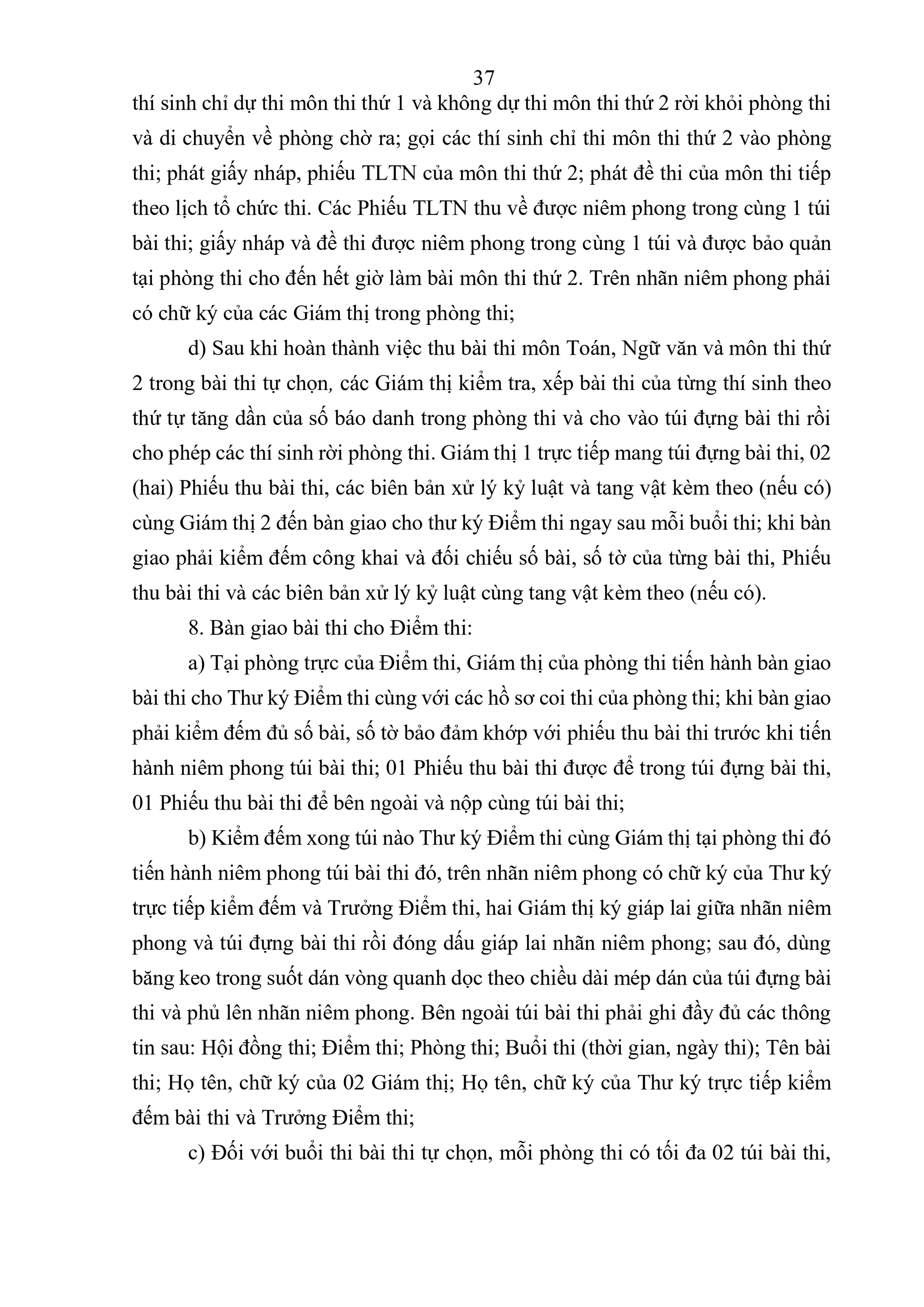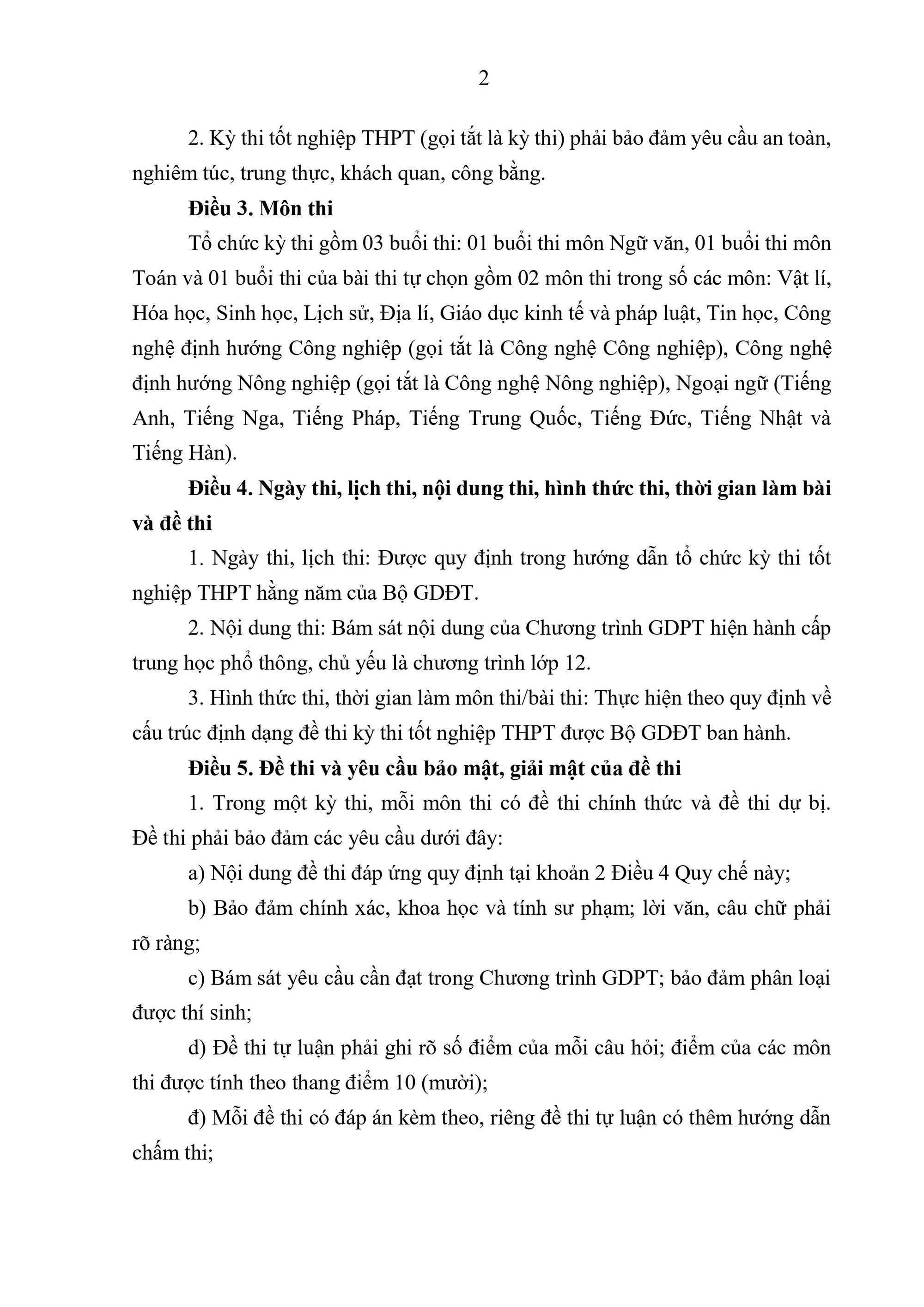 Tổ chức kỳ thi gồm 03 buổi thi: 01 buổi thi môn Ngữ văn, 01 buổi thi môn Toán và 01 buổi thi của bài thi tự chọn gồm 02 môn thi trong số các môn: Vật lí, Hóa học, Sinh học, Lịch sử, Địa lí, Giáo dục kinh tế và pháp luật, Tin học, Công nghệ định hướng Công nghiệp (gọi tắt là Công nghệ Công nghiệp), Công nghệ định hướng Nông nghiệp (gọi tắt là Công nghệ Nông nghiệp), Ngoại ngữ (Tiếng Anh, Tiếng Nga, Tiếng Pháp, Tiếng Trung Quốc, Tiếng Đức, Tiếng Nhật và Tiếng Hàn).