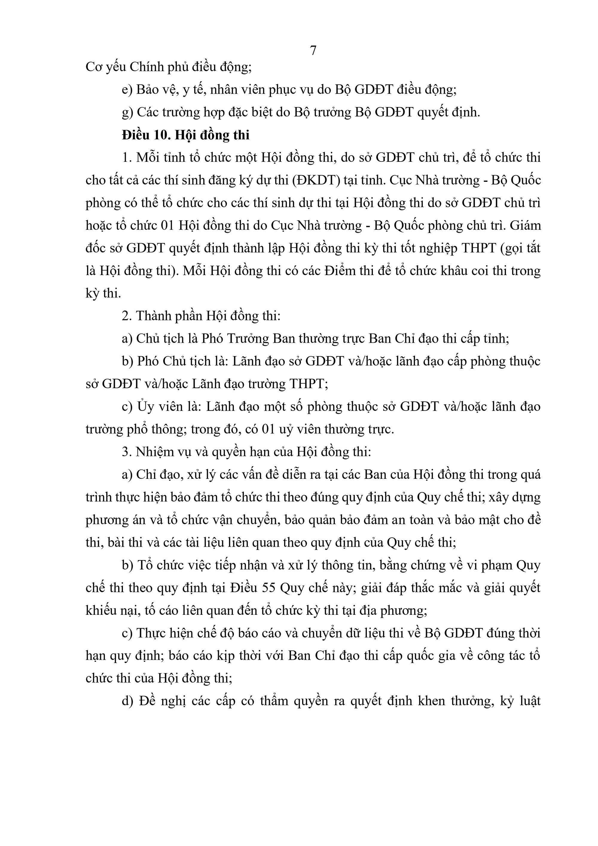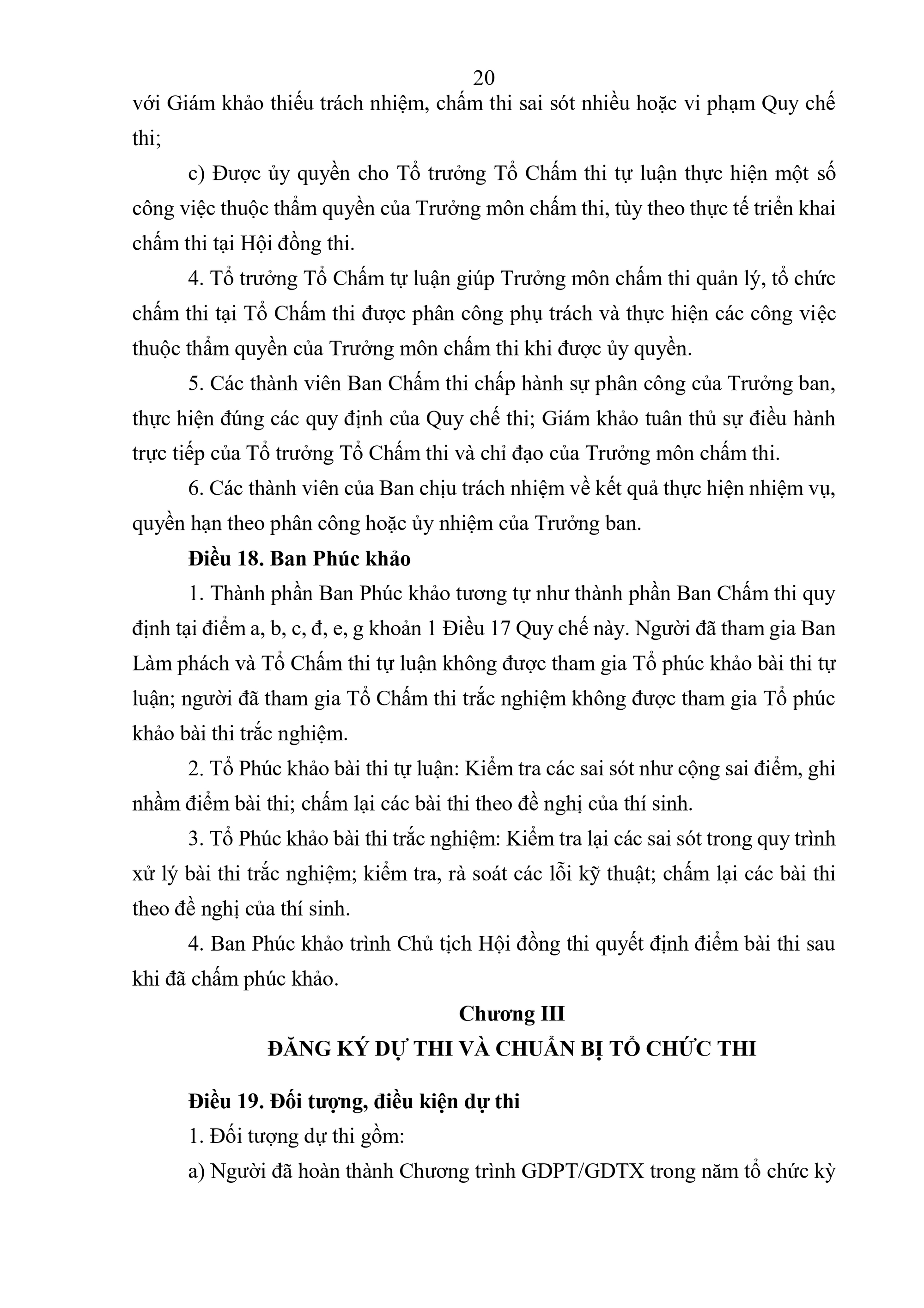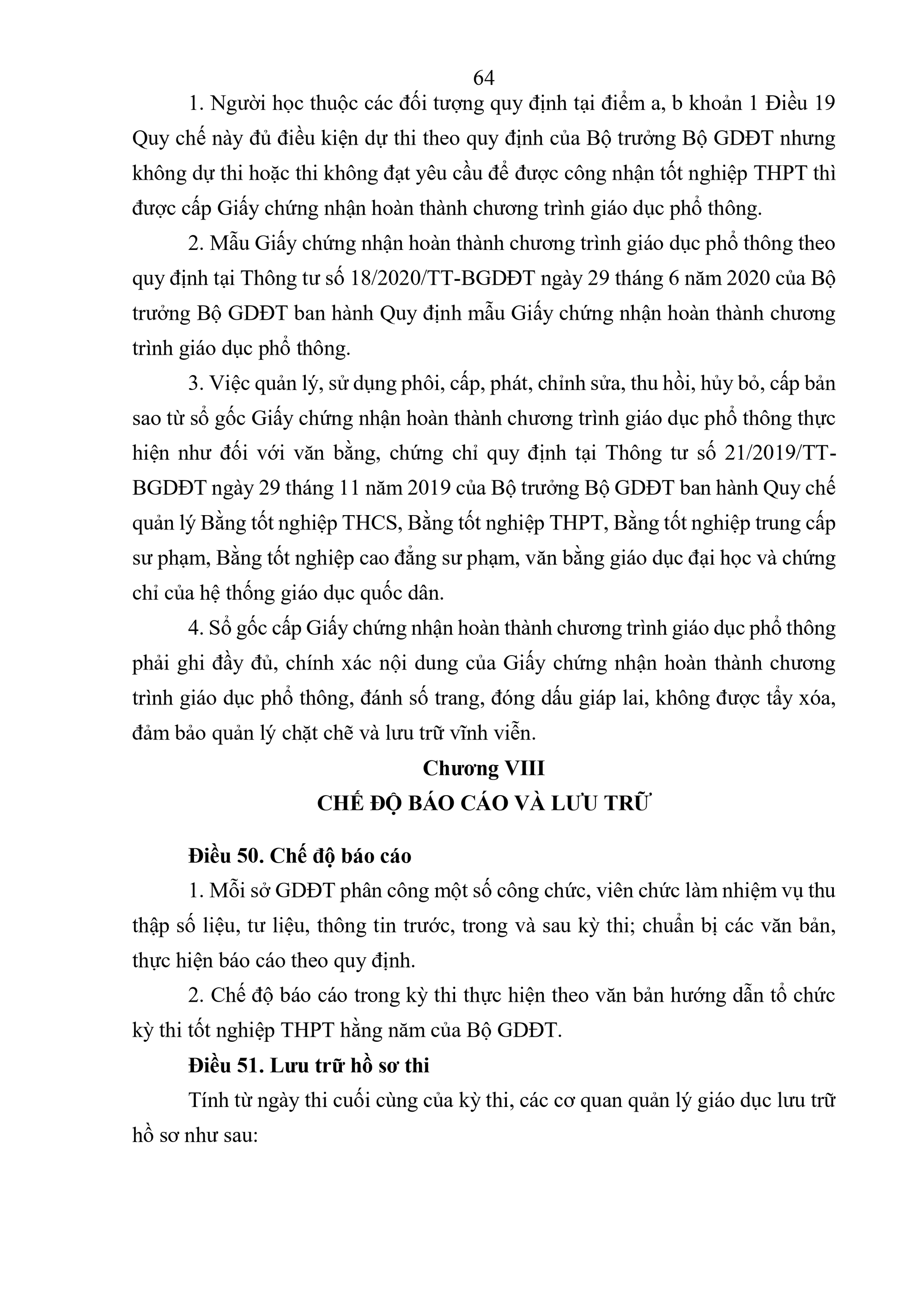 Quy chế Thi tốt nghiệp trung học phổ thông quy định về thi tốt nghiệp trung học phổ thông (sau đây gọi là Quy chế thi) bao gồm: Quy định chung; tổ chức thi và quản lý kỳ thi; đăng ký dự thi và chuẩn bị tổ chức thi; công tác in sao đề thi; coi thi; chấm thi; phúc khảo và chấm thẩm định; xét công nhận tốt nghiệp trung học phổ thông (THPT) và cấp Giấy chứng nhận hoàn thành chương trình giáo dục phổ thông; chế độ báo cáo và lưu trữ; kiểm tra, khen thưởng, xử lý các sự cố bất thường và xử lý vi phạm; tổ chức thực hiện.