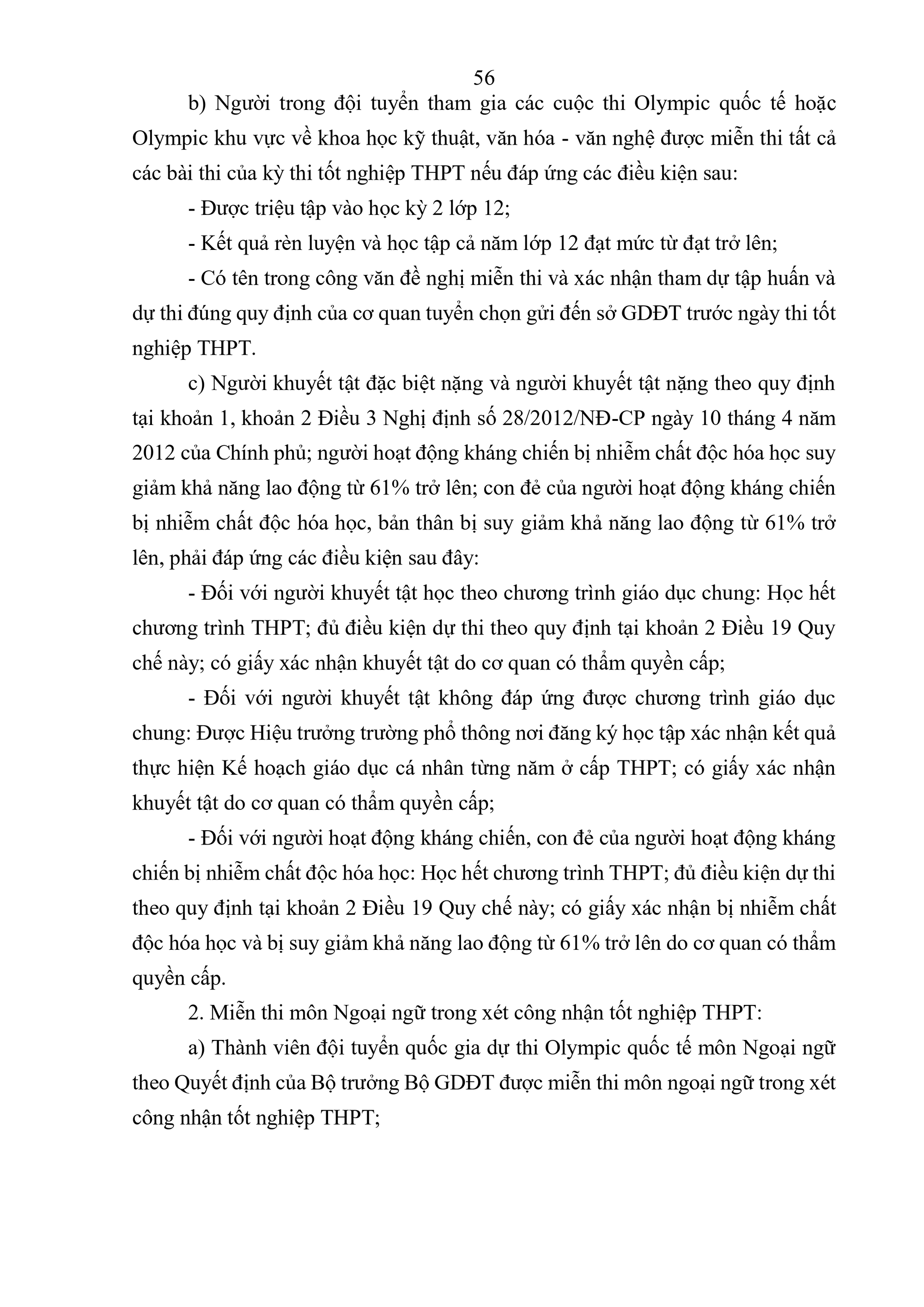 a) Thành viên đội tuyển quốc gia dự thi Olympic quốc tế môn Ngoại ngữ theo Quyết định của Bộ trưởng Bộ GDĐT được miễn thi môn ngoại ngữ trong xét công nhận tốt nghiệp THPT;
