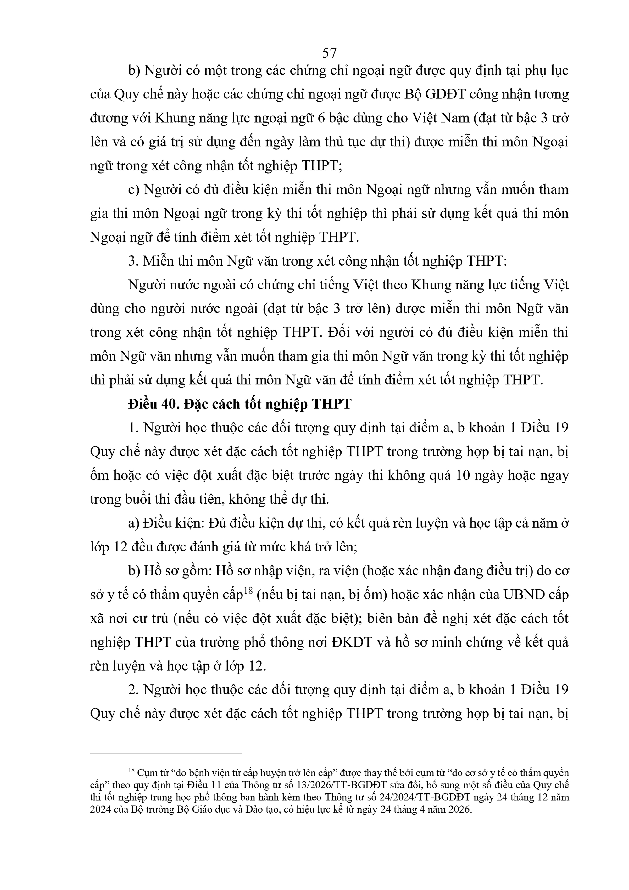 Người nước ngoài có chứng chỉ tiếng Việt theo Khung năng lực tiếng Việt dùng cho người nước ngoài (đạt từ bậc 3 trở lên) được miễn thi môn Ngữ văn trong xét công nhận tốt nghiệp THPT. Đối với người có đủ điều kiện miễn thi môn Ngữ văn nhưng vẫn muốn tham gia thi môn Ngữ văn trong kỳ thi tốt nghiệp thì phải sử dụng kết quả thi môn Ngữ văn để tính điểm xét tốt nghiệp THPT.
