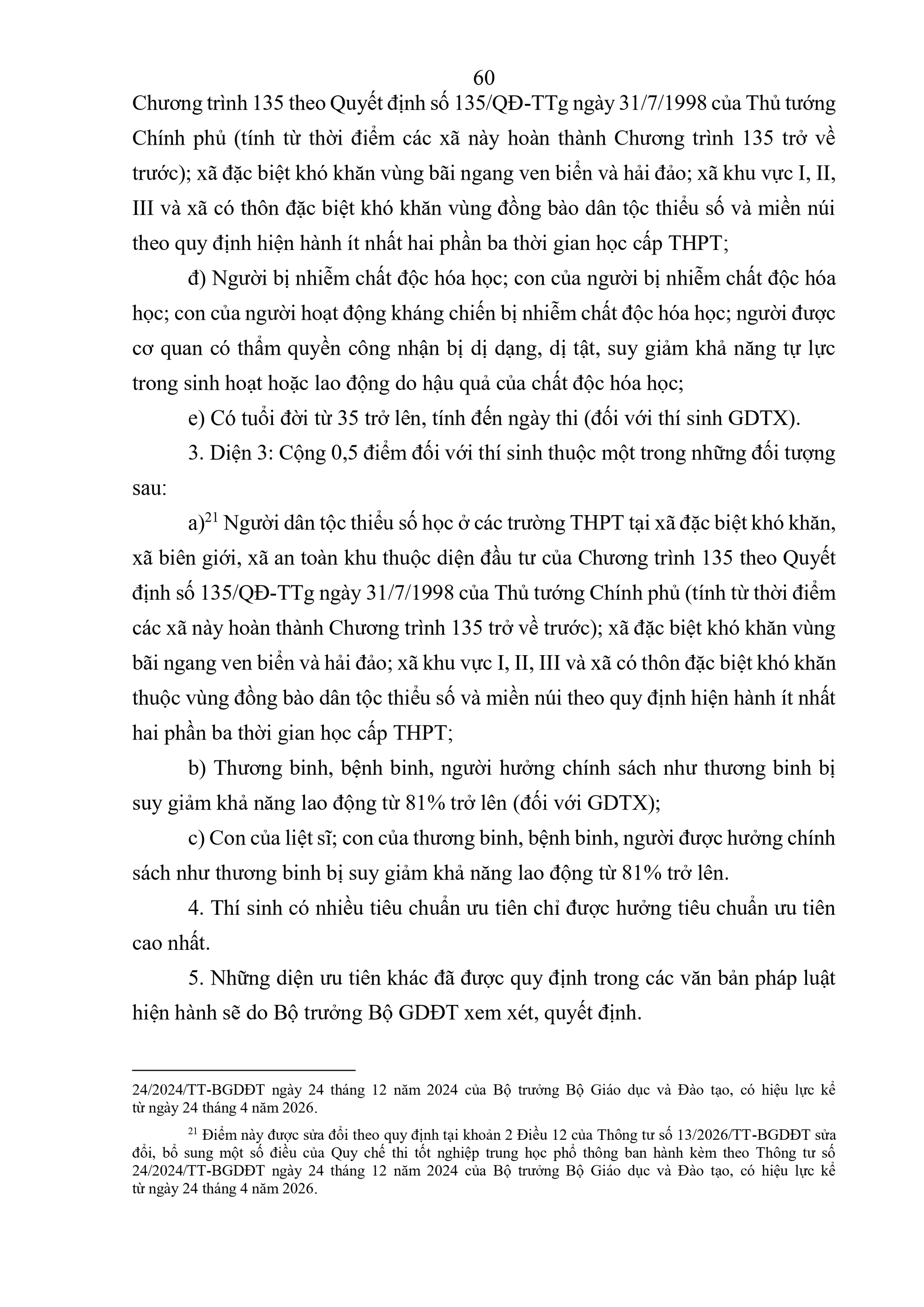 - Đối với người hoạt động kháng chiến, con đẻ của người hoạt động kháng chiến bị nhiễm chất độc hóa học: Học hết chương trình THPT; đủ điều kiện dự thi theo quy định tại khoản 2 Điều 19 Quy chế này; có giấy xác nhận bị nhiễm chất độc hóa học và bị suy giảm khả năng lao động từ 61% trở lên do cơ quan có thẩm quyền cấp.