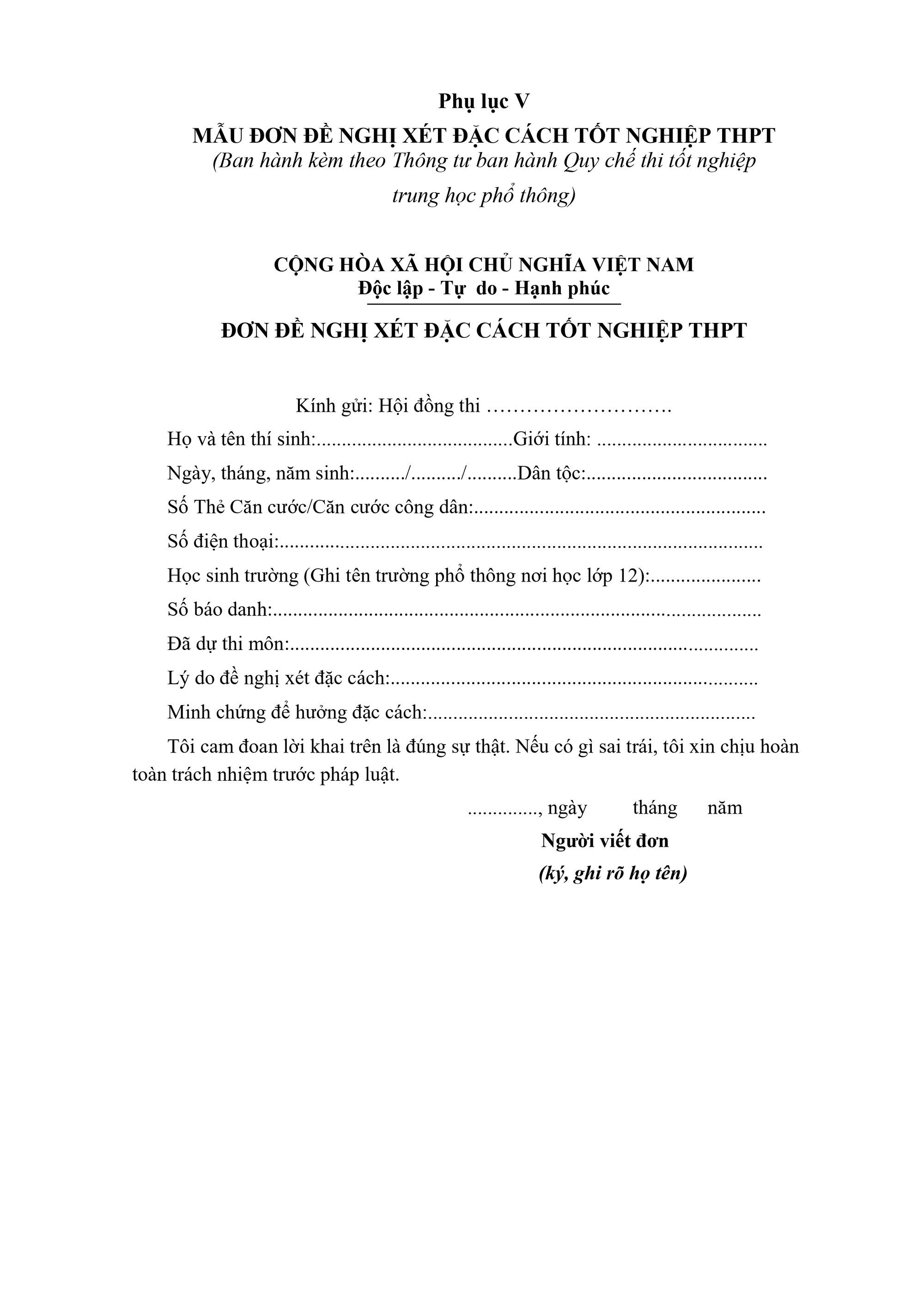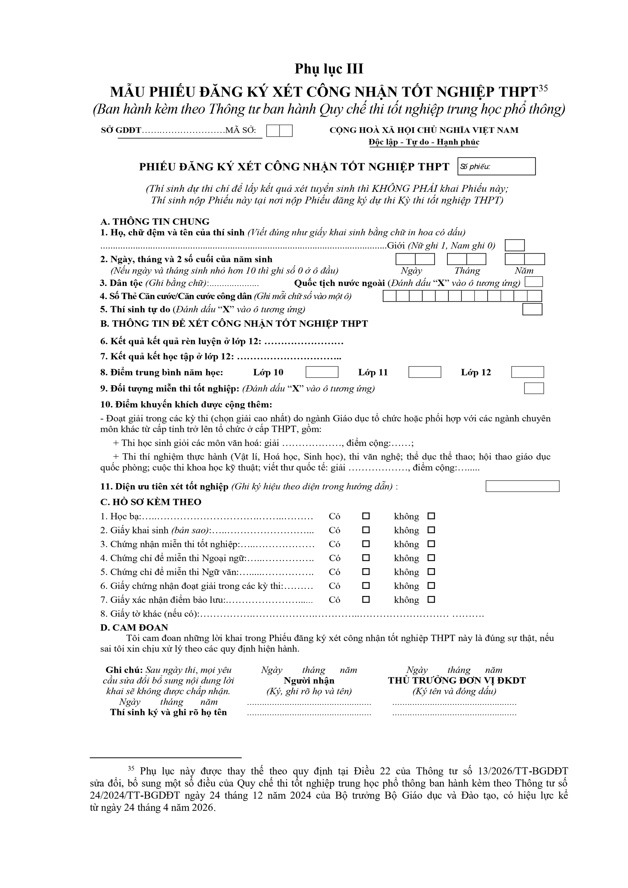 - Đối với người khuyết tật không đáp ứng được chương trình giáo dục chung: Được Hiệu trưởng trường phổ thông nơi đăng ký học tập xác nhận kết quả thực hiện Kế hoạch giáo dục cá nhân từng năm ở cấp THPT; có giấy xác nhận khuyết tật do cơ quan có thẩm quyền cấp;
