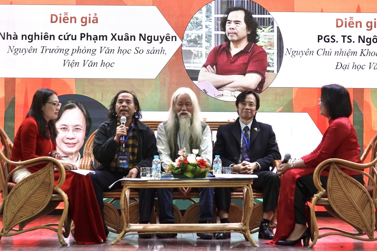 Các diễn giả tại buổi Hội thảo, từ trái sang phải: PGS.TS Ngô Văn Giá, nhà nghiên cứu Phạm Xuân Nguyên, PGS.TS Phùng Gia Thế. Ảnh: Thúy Hạnh.