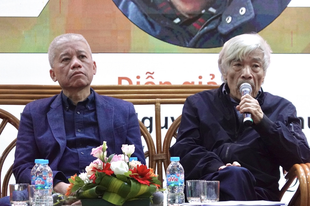 Nhà văn Nguyễn Việt Hà (bên trái) và nhà văn Bảo Ninh (bên phải). Ảnh: Thúy Hạnh.