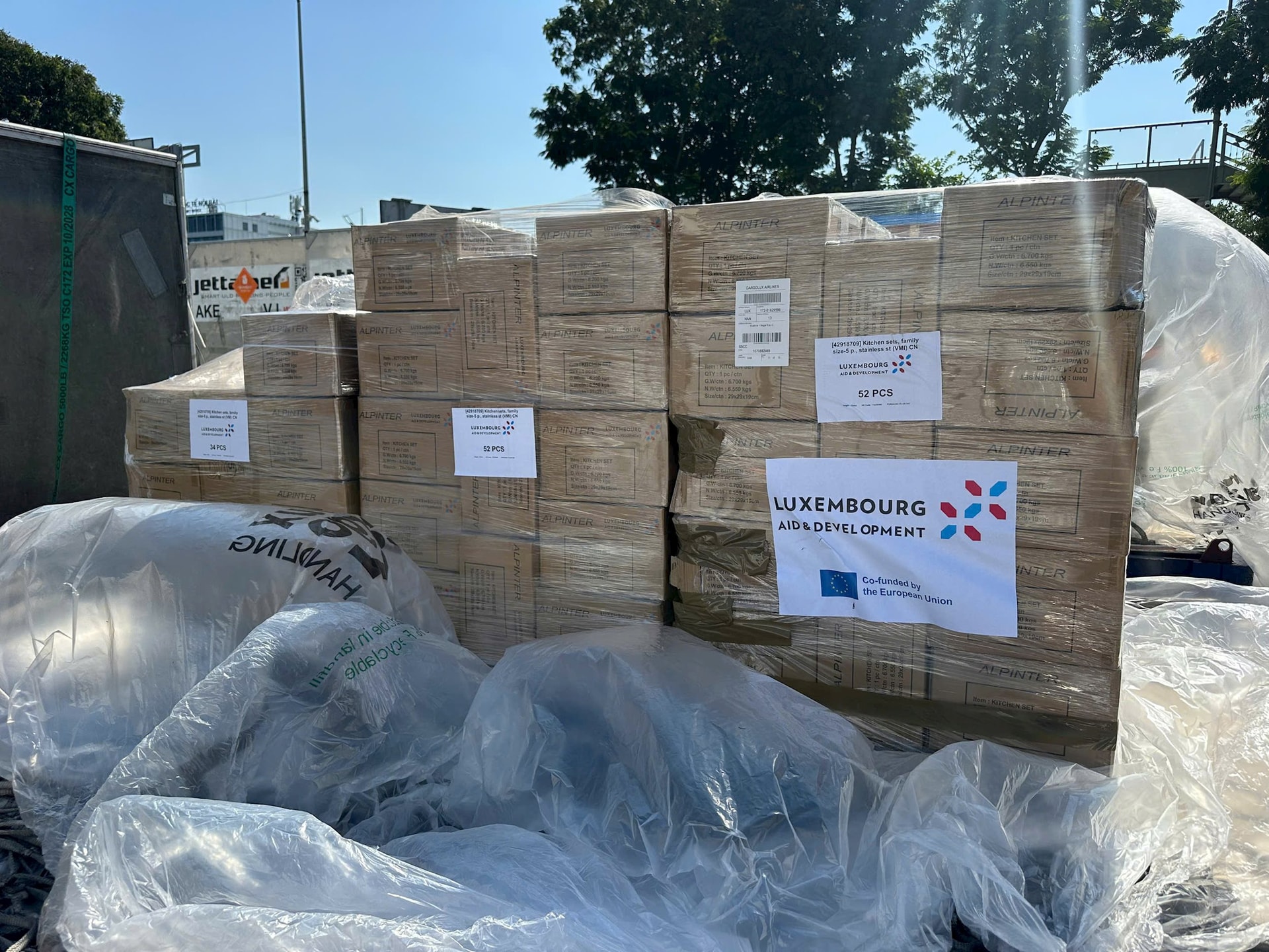 Hàng viện trợ bao gồm 138 bộ dụng cụ bếp bằng inox với đầy đủ nồi, chảo, xoong phục vụ nhu cầu nấu nướng cơ bản, cùng 150 bộ lều bạt gia đình.