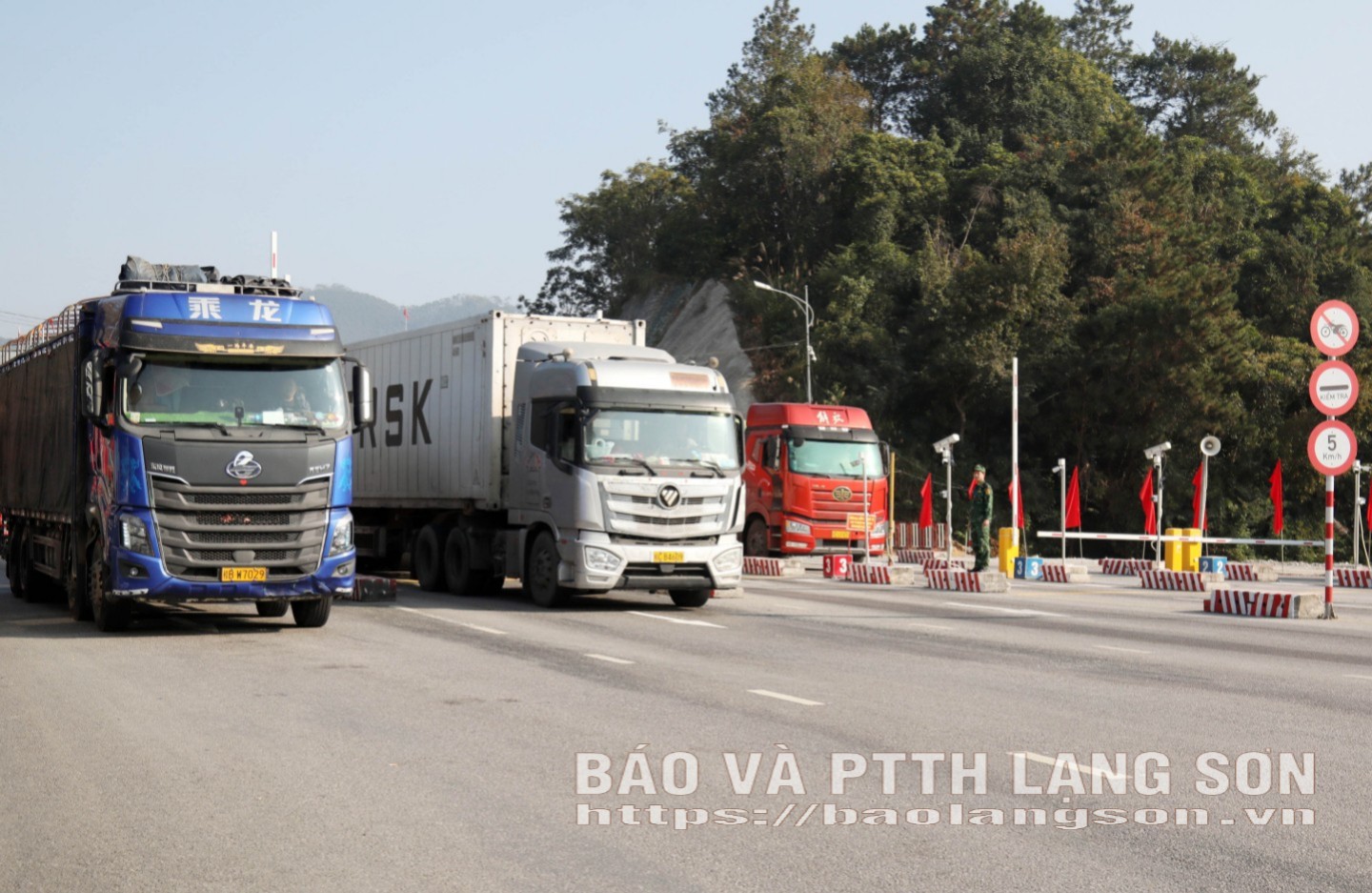 Lực lượng chức năng điều tiết phương tiện chở hàng hóa nhập khẩu thông quan qua đường chuyên dụng vận chuyển hàng hóa khu vực mốc 1119-1120 thuộc cửa khẩu quốc tế Hữu Nghị