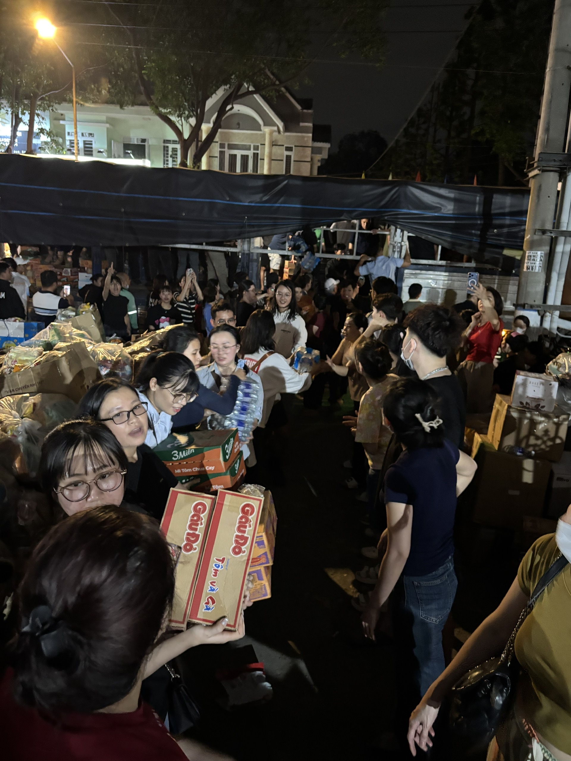 Hàng trăm tình nguyện viên tham gia nhận, phân loại hàng cứu trợ.