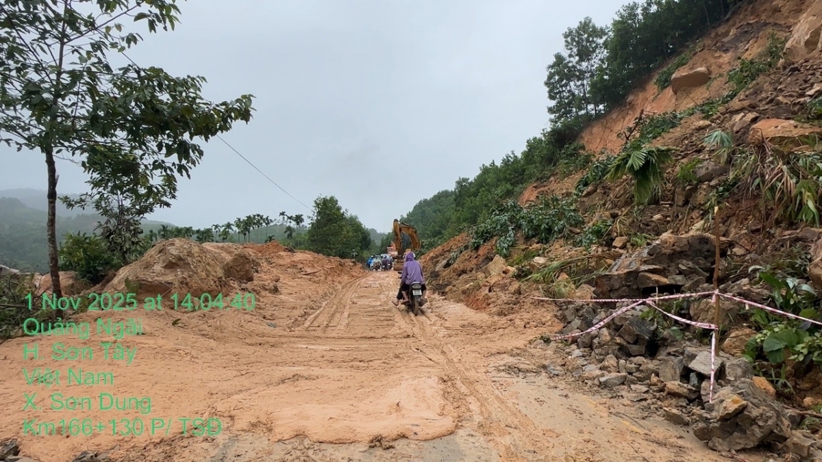 Tại Quảng Ngãi, còn 3 vị trí trên đường Trường Sơn Đông do sạt lở taluy dương, dự kiến 18h cùng ngày thông xe một làn.
