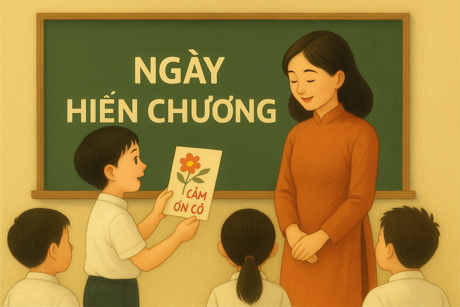 Ký ức về Ngày hiến chương thuở ấu thơ trong tôi vẫn nguyên vẹn: những đứa học trò cấp 1 trong áo trắng tinh tươm, tay nắm chặt tấm thiệp tự làm với những nét chữ ngây ngô, những hình vẽ vụng về nhưng chan chứa tình cảm. Ngày hôm ấy, bục giảng trang nghiêm bỗng trở nên ấm áp, ngập tràn tình thương. Cả lớp xôn xao, thầm thì, ánh mắt đổ dồn về cánh cửa, đợi chờ bóng dáng thân quen của thầy, cô bước vào lớp.