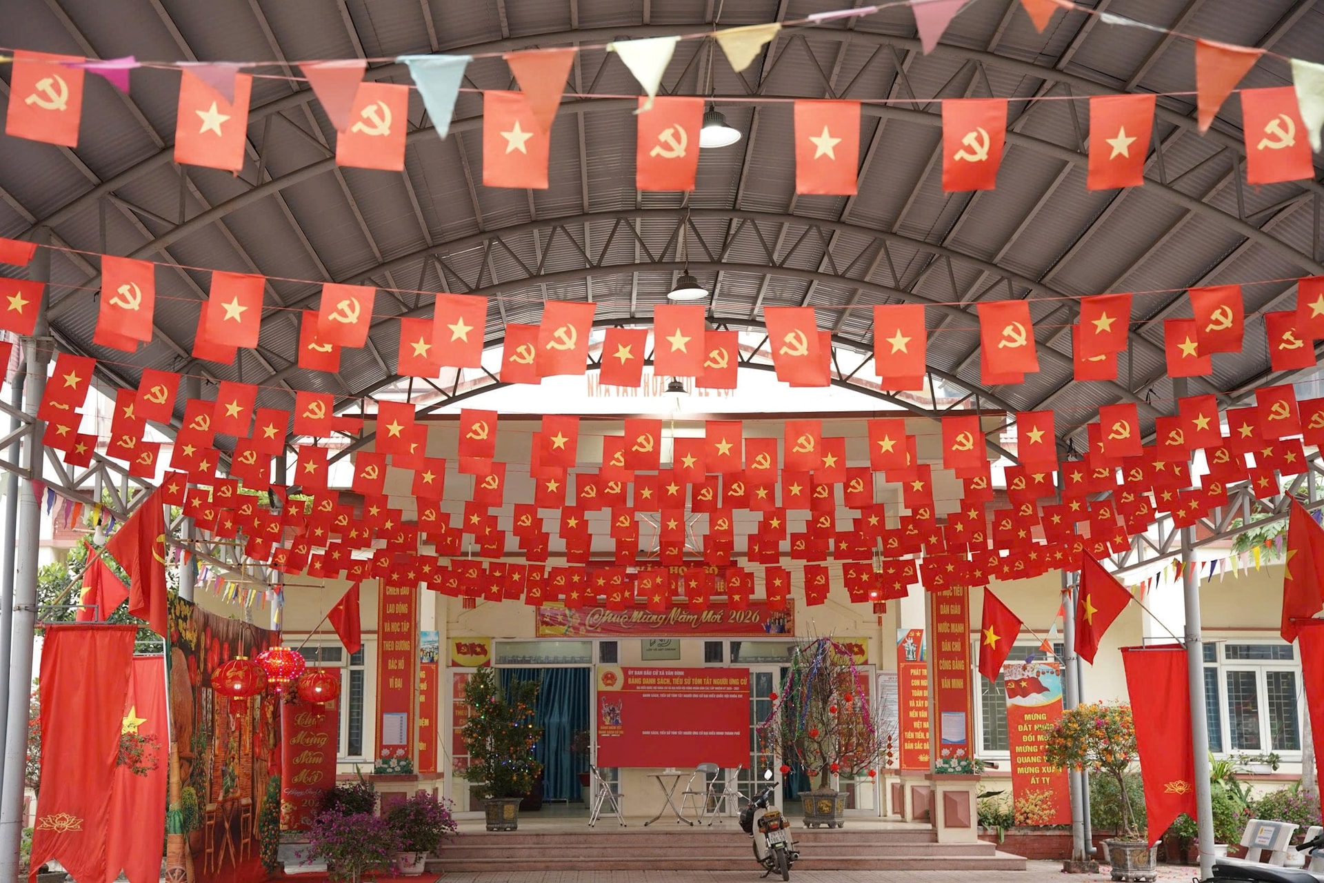 Tại Nhà văn hóa thôn Hoàng Dương, một trong những điểm bầu cử của xã, công tác chuẩn bị đã hoàn tất từ nhiều ngày trước. Ngay từ cổng vào, tấm băng rôn đỏ nổi bật dòng chữ chào mừng ngày bầu cử được treo trang trọng. Sân nhà văn hóa được quét dọn sạch sẽ, cây xanh được cắt tỉa gọn gàng, khu vực bỏ phiếu được bố trí khoa học, thuận tiện.