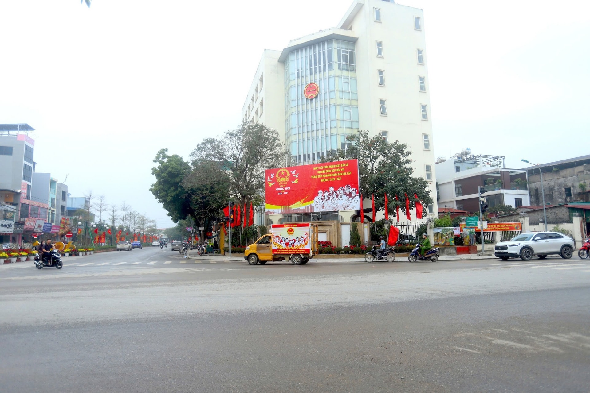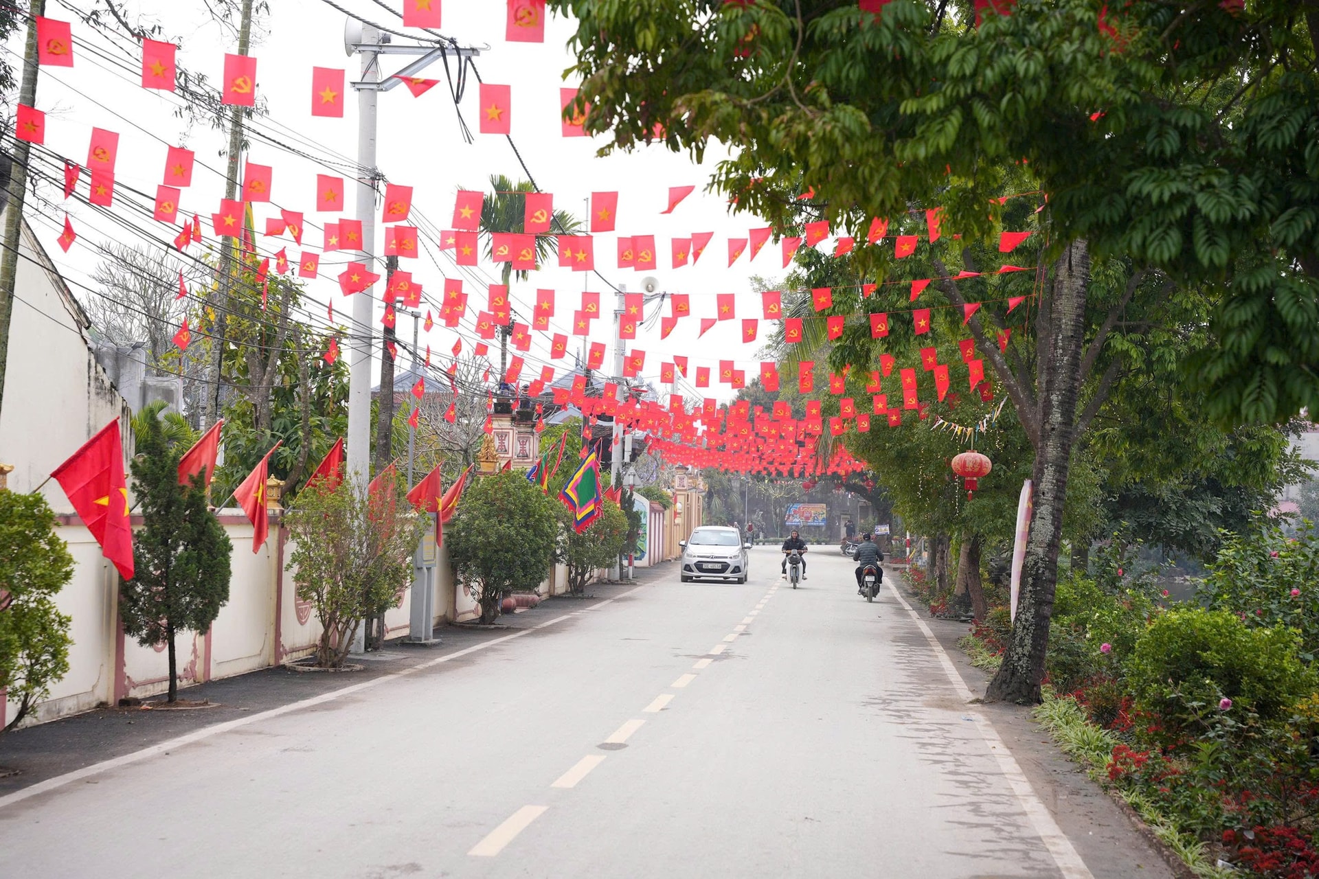 Cờ Tổ quốc rực rỡ, cùng với các tổ tuyên truyền lưu động về ngày bầu cử trên các tuyến đường trung tâm xã Vân Đình. Ảnh: Thanh Trang