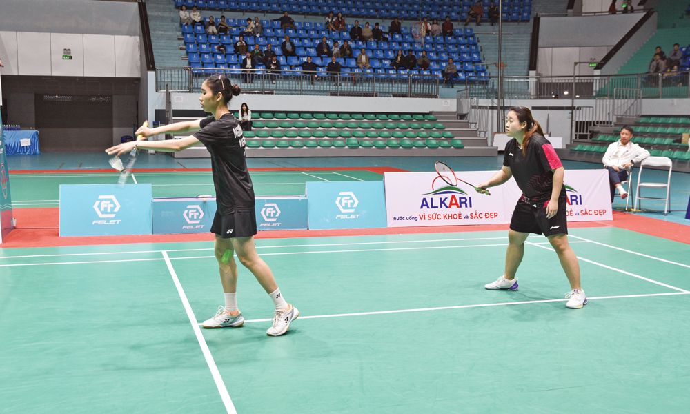 Nguyễn Thị Ngọc Lan (phía trước) và Thân Vân Anh thể hiện sự ăn ý tại Giải Cầu lông quốc tế Felet Vietnam International Series 2025 tổ chức tại Bắc Ninh.