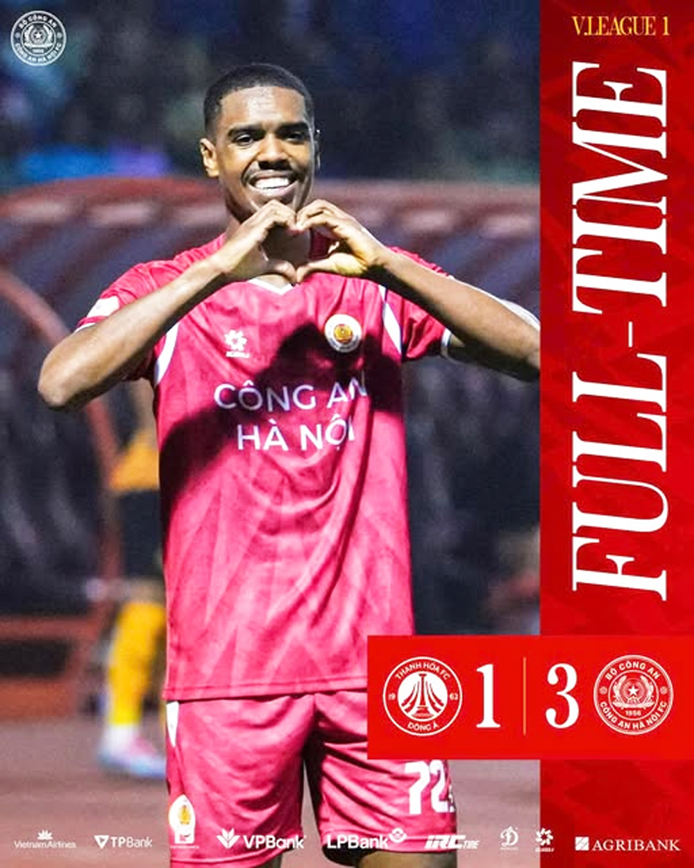 Cuộc đối đầu giữa Thanh Hóa và Công an Hà Nội (CAHN) ở vòng 10 V-League (đấu bù) diễn ra hấp dẫn và kết thúc với chiến thắng 3-1 dành cho đội khách Công an Hà Nội.