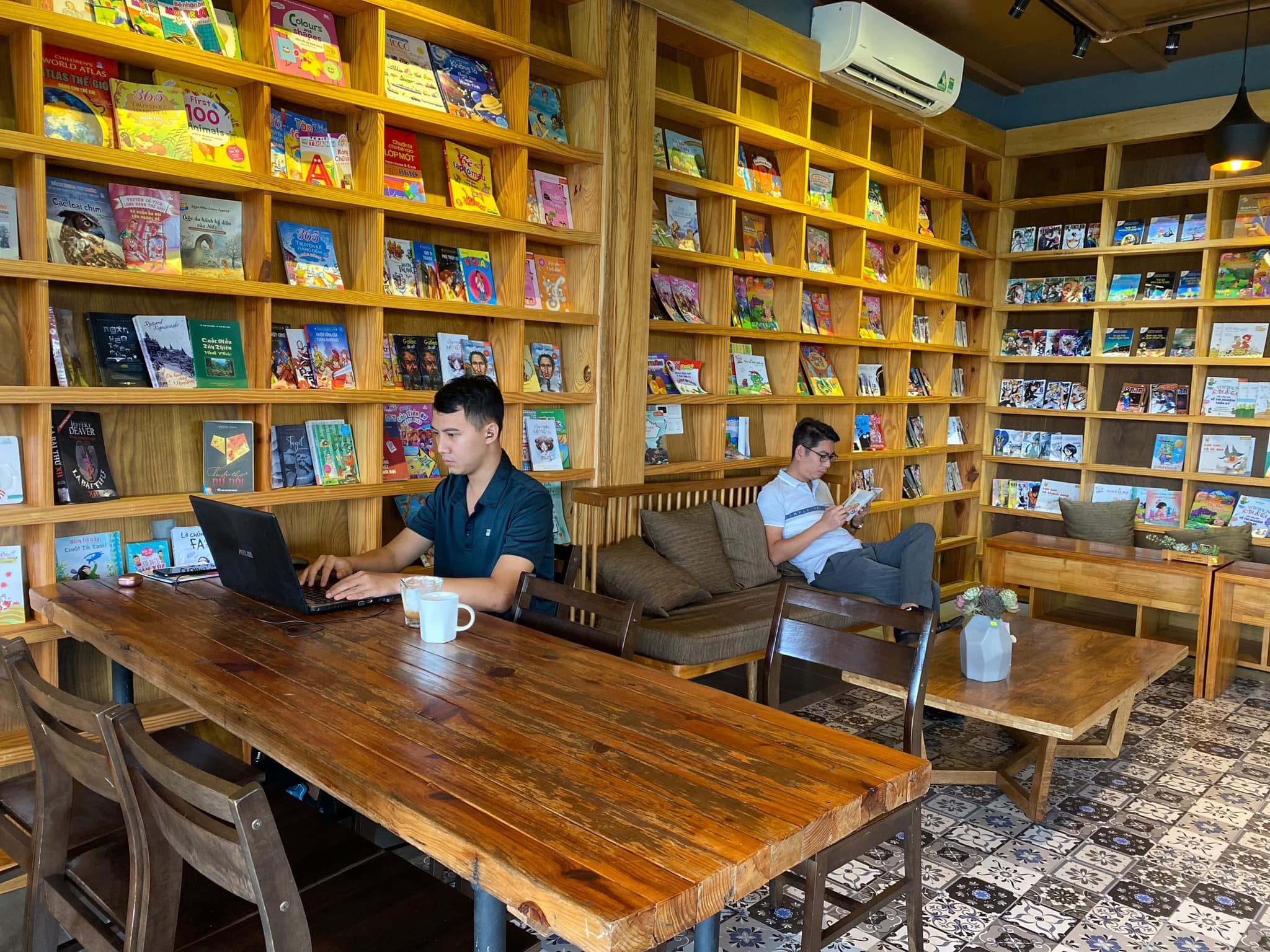 Bạn trẻ lựa chọn không gian quán cà phê để đọc sách, kết hợp giữa sách in và thiết bị số, cho thấy xu hướng tiếp cận tri thức linh hoạt trong thời đại công nghệ.
