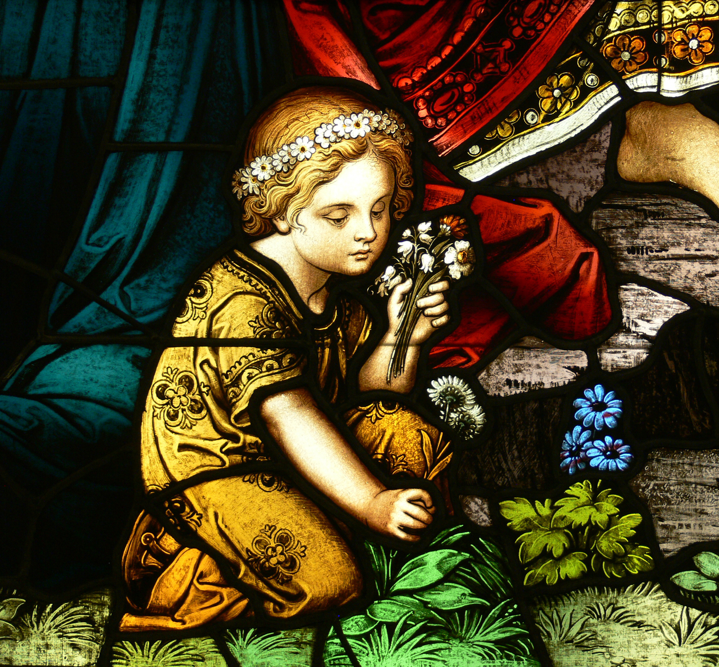 Hình ảnh những em bé hái hoa tặng Chúa được tái hiện trên tường kính các nhà thờ lớn ở Los Angles, Mỹ. (Ảnh: Wikipedia)