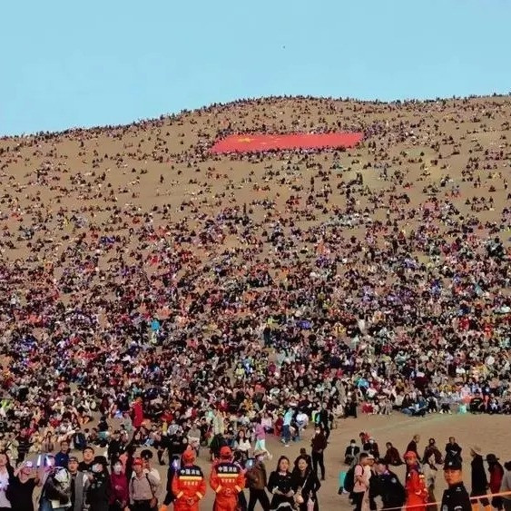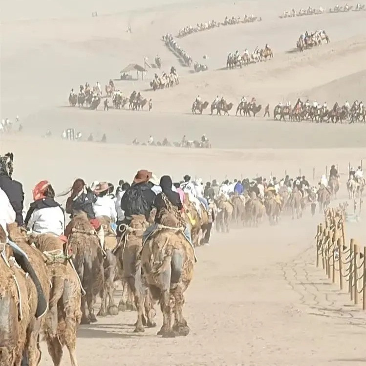 Cảnh tượng tương tự cũng diễn ra trên cồn cát khu thắng cảnh Minh Sa - Hồ Nguyệt Nha ở Đôn Hoàng, tỉnh Cam Túc. Hàng trăm con lạc đà gây tắc nghẽn trên cồn cát sa mạc.