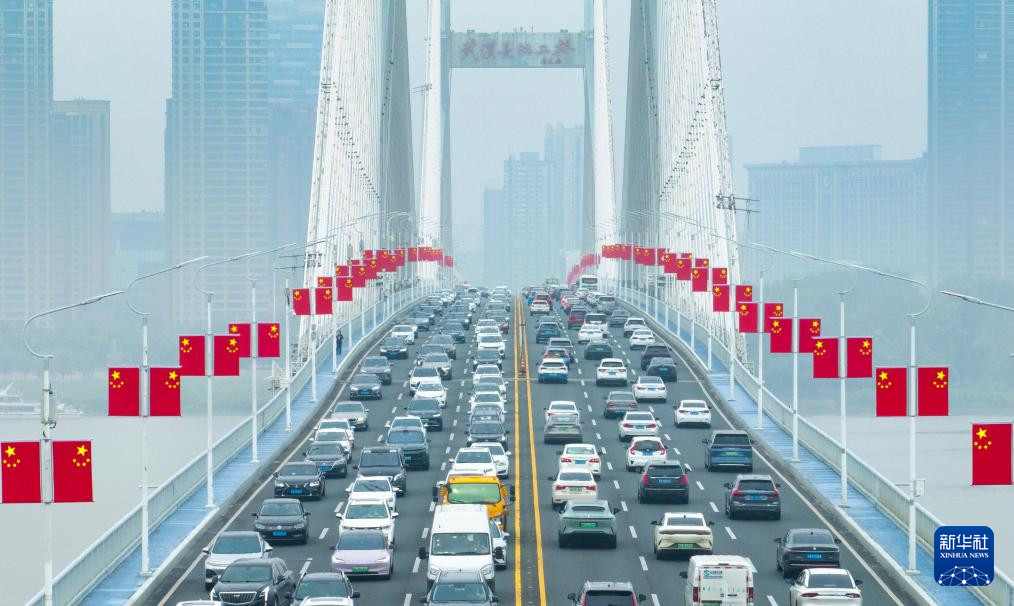Cầu sông Dương Tử ở Vũ Hán, tỉnh Hồ Bắc, miền Trung Trung Quốc, sáng 1/10. Ảnh: Xinhua News