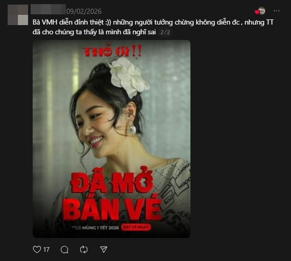 Trải qua 2 ngày chiếu đầu tiên, Thỏ Ơi!! đã trở thành cái tên dẫn đầu phòng vé dịp Tết 2026 với doanh thu nhanh chóng chạm ngưỡng 75 tỷ đồng. Bộ phim thứ 5 trong sự nghiệp của đạo diễn Trấn Thành ghi dấu ấn với dàn sao đa phần "lấn sân" từ lĩnh vực khác, nhưng đều làm tròn trịa vai trò của mình. Đặc biệt, Văn Mai Hương hiện đang là cái tên gây sốt hơn cả trên mạng xã hội.