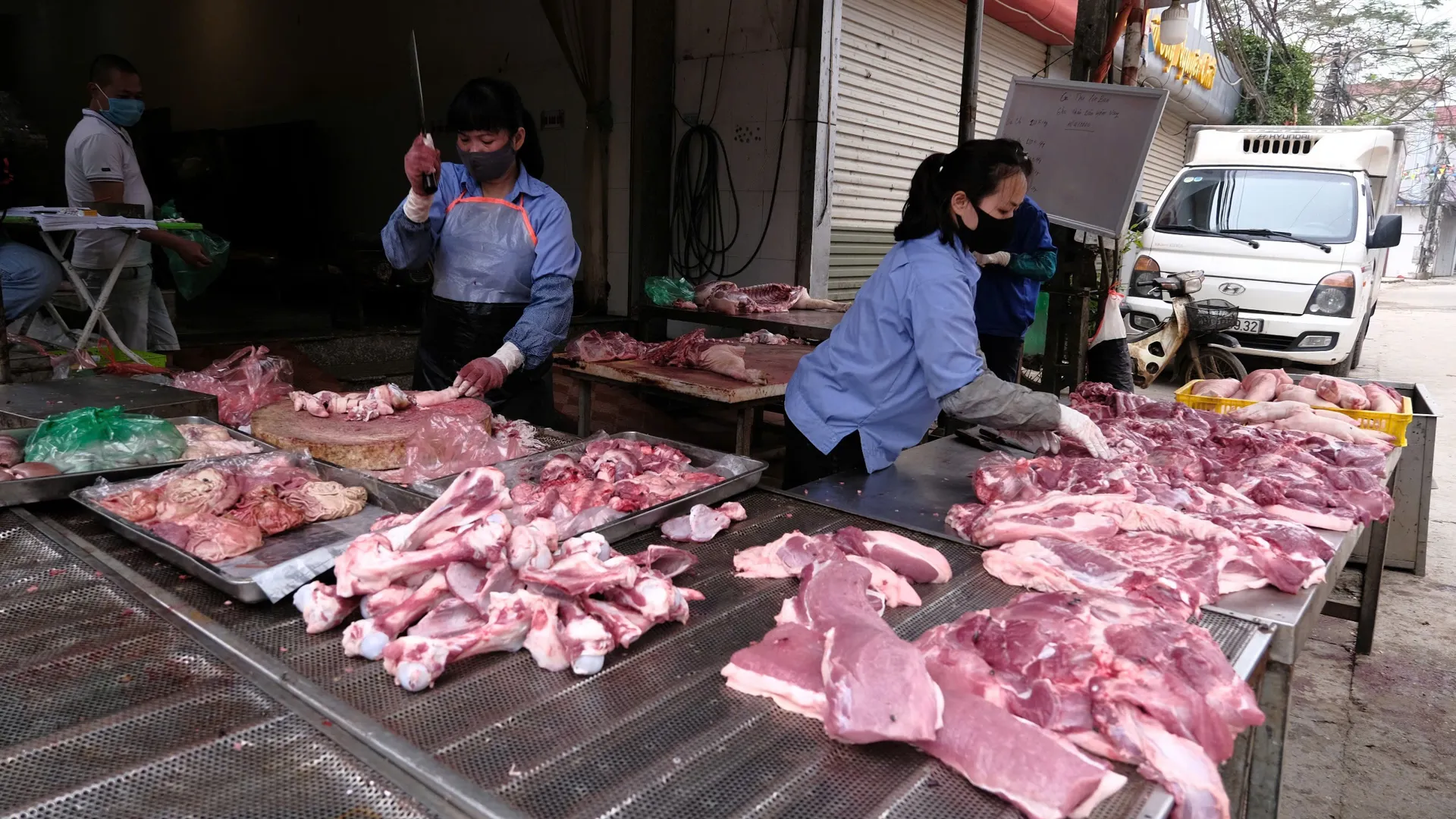 Các quầy hàng thịt tại chợ dân sinh trên địa bàn xã Mê Linh, Hà Nội. Ảnh: Phạm Hùng