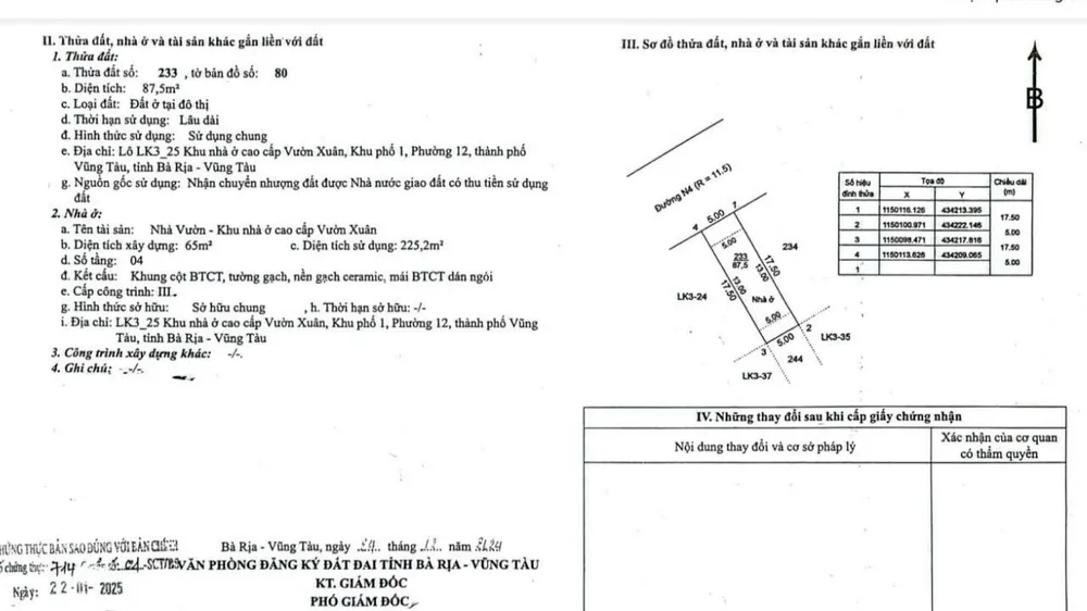 Vợ chồng T đưa ra giấy chứng nhận quyền sở hữu nhà ở và tài sản gắn liền với đất của căn nhà trên đứng tên vợ chồng T, được Văn phòng đăng ký đất đai tỉnh Bà Rịa - Vũng Tàu cấp ngày 24-12-2024.