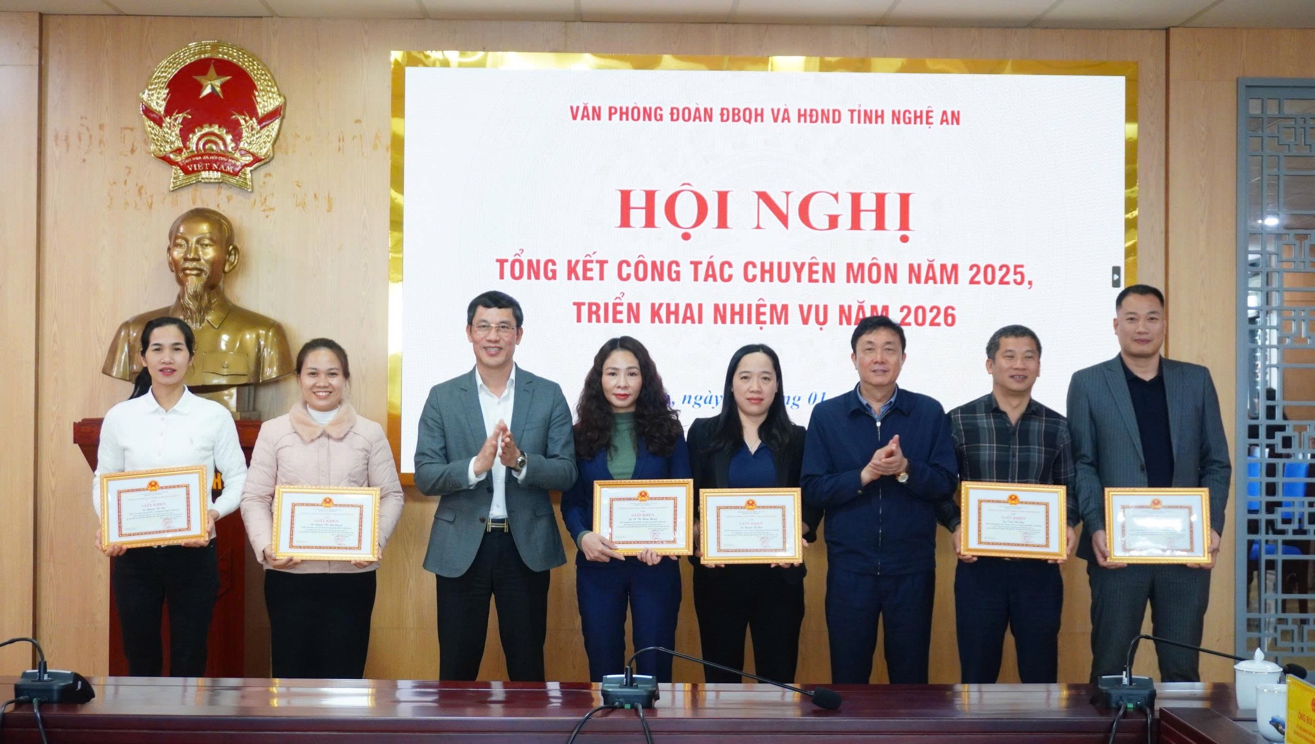 Hội nghị đã công bố và trao danh hiệu “Chiến sĩ thi đua cơ sở” năm 2025 cho 18 đồng chí; trao Bằng khen của Chủ nhiệm Văn phòng Quốc hội cho 3 đồng chí và trao Giấy khen của Chánh Văn phòng Đoàn ĐBQH và HĐND tỉnh cho 7 đồng chí có nhiều đóng góp tích cực trong thực hiện nhiệm vụ chuyên môn.