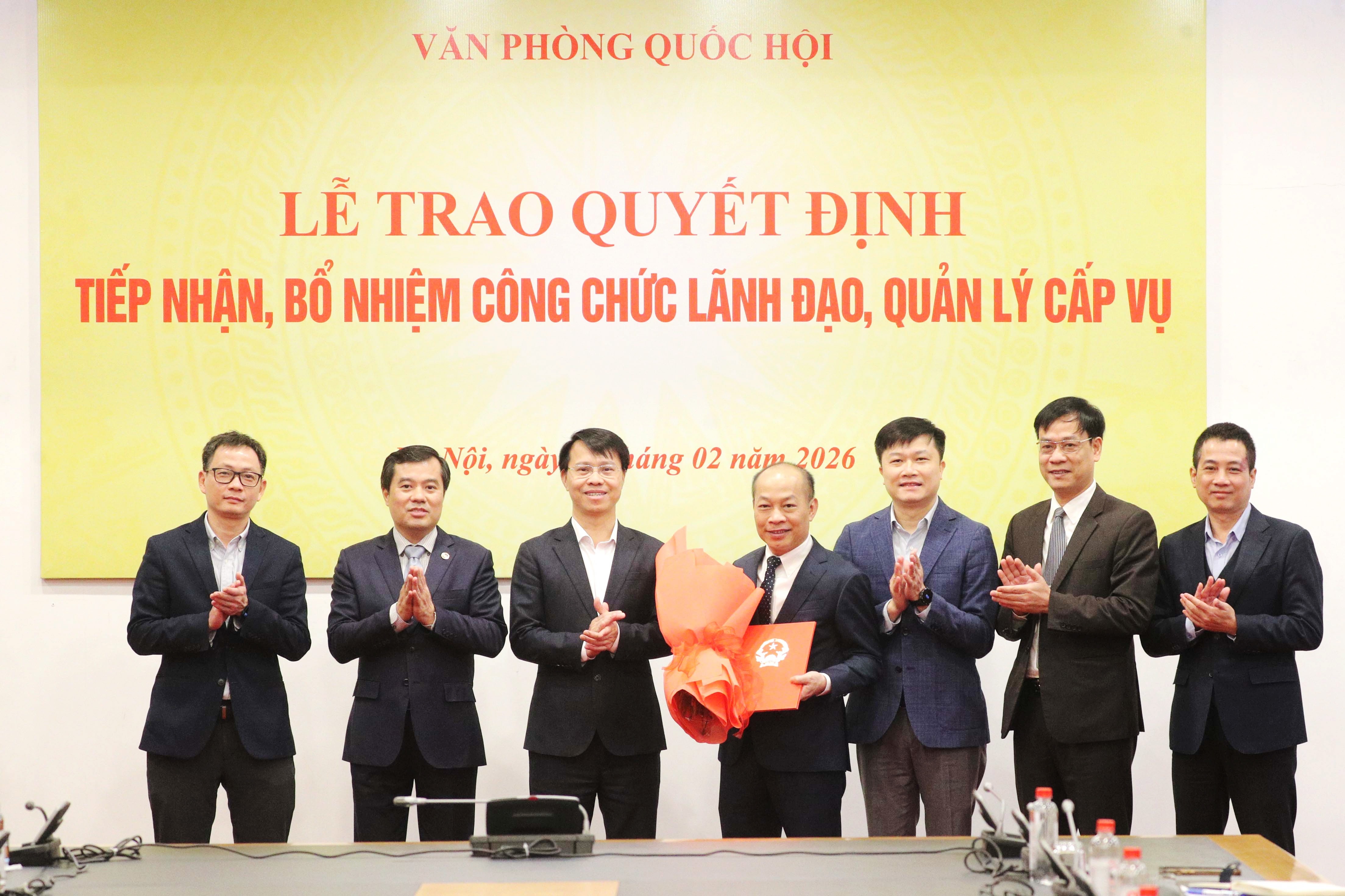 Phó Chủ nhiệm Văn phòng Quốc hội Nguyễn Mạnh Hùng trao Quyết định và tặng hoa chúc mừng Phó Vụ trưởng Vụ Chuyển đổi số Phạm Xuân Kiên