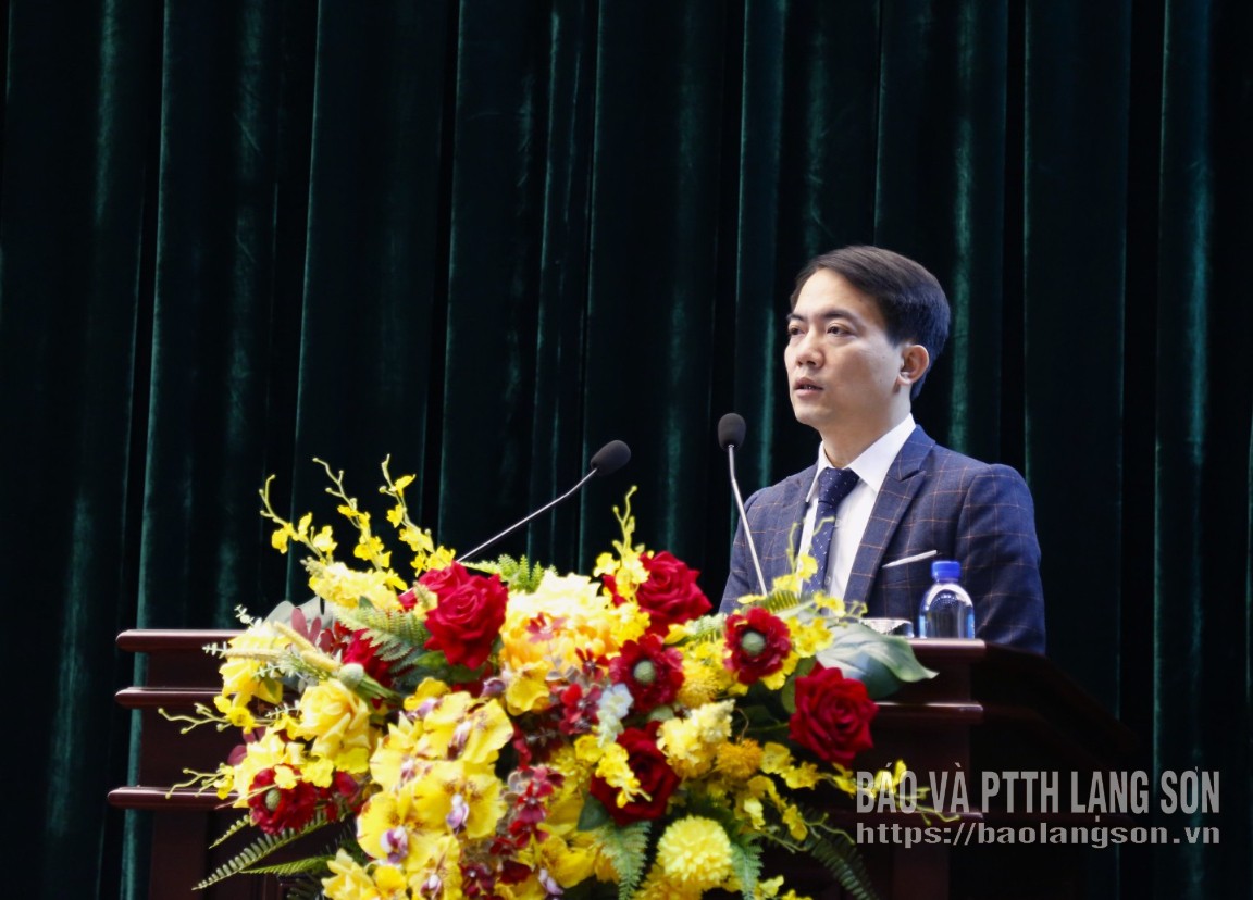 Đồng chí Đinh Đức Chính, Bí thư Đảng ủy, Chánh Văn phòng Tỉnh ủy phát biểu tại hội nghị