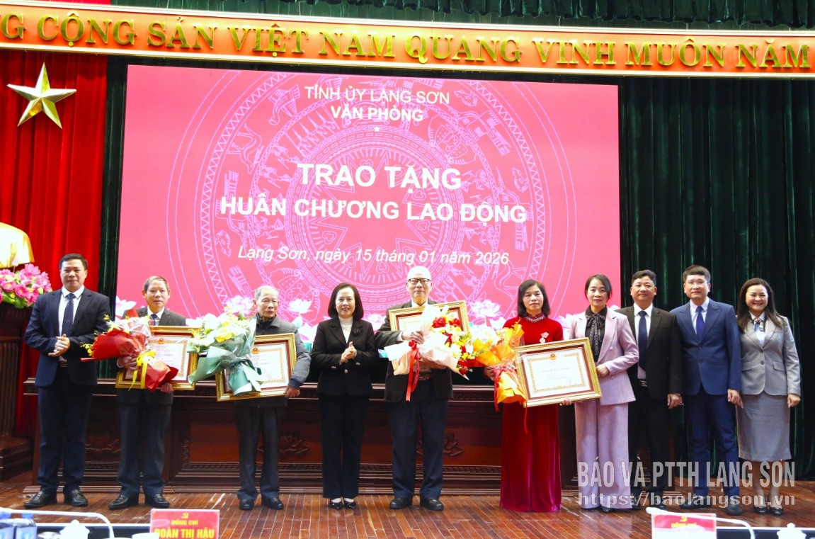 Thừa ủy quyền Chủ tịch nước, đồng chí Đoàn Thị Hậu, Phó Bí thư Thường trực Tỉnh ủy, Chủ tịch HĐND tỉnh, Bí thư Đảng ủy Các cơ quan Đảng tỉnh trao Huân chương lao động tặng các đồng chí nguyên lãnh đạo Ban Kinh tế Tỉnh ủy và nguyên lãnh đạo Văn phòng Tỉnh ủy