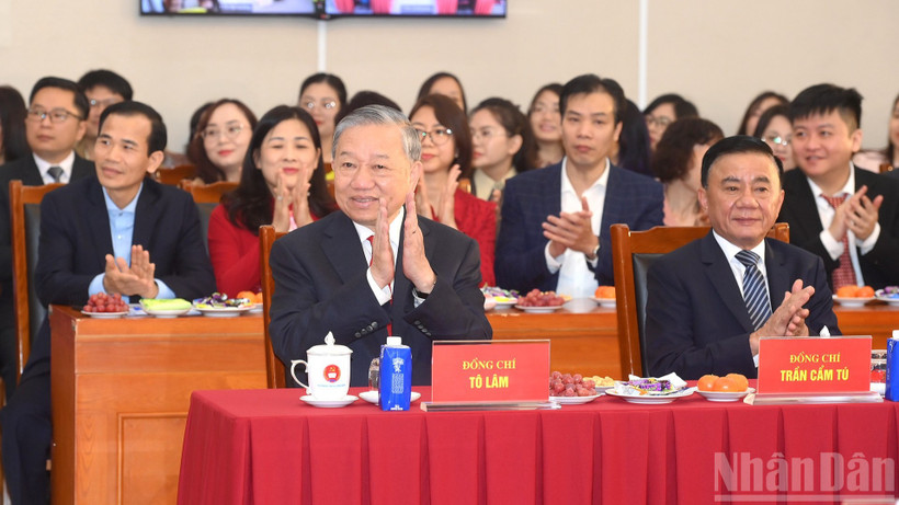 Tổng Bí thư Tô Lâm, Thường trực Ban Bí thư Trần Cẩm Tú tham dự buổi gặp mặt. (Ảnh: ĐĂNG KHOA)