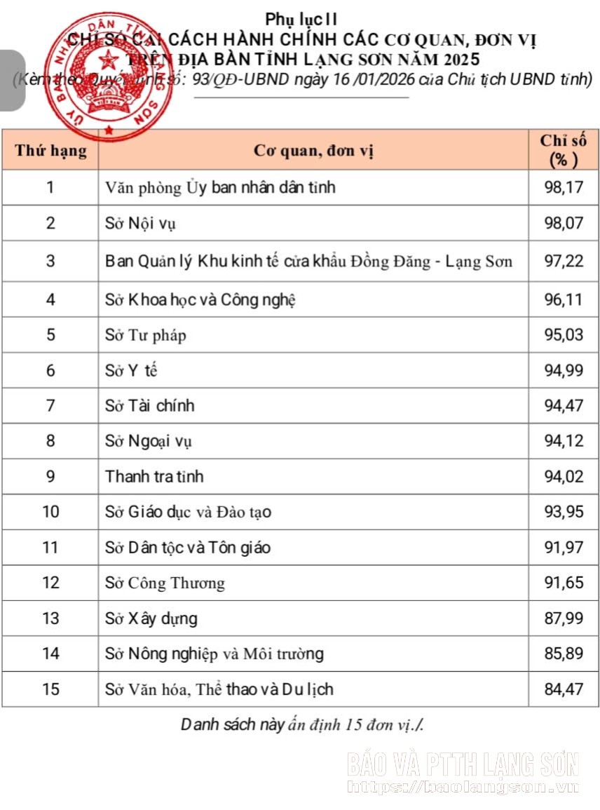 Xếp sau Văn phòng UBND tỉnh là Sở Nội vụ xếp vị trí thứ 2 (98,07%) và Ban Quản lý Khu Kinh tế cửa khẩu Đồng Đăng – Lạng Sơn xếp vị trí thứ 3 (97,22%). Sở Văn hóa, Thể thao và Du lịch đứng ở cuối bảng xếp hạng với kết quả chỉ số là 84,47%. Theo đánh giá của cơ quan chuyên môn, tuy có sự khác nhau về điểm số và thứ hạng nhưng kết quả chỉ số CCHC năm 2025 khá cao, không có đơn vị nào dưới 80%.