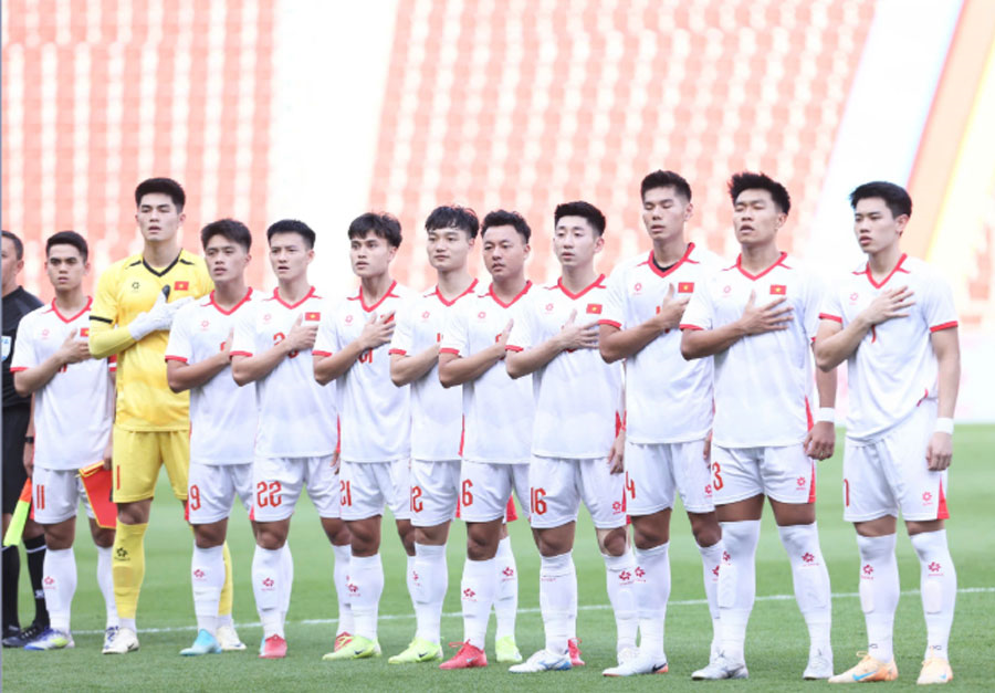 Các tuyển thủ U.22 Việt Nam trong nghi thức chào cờ.