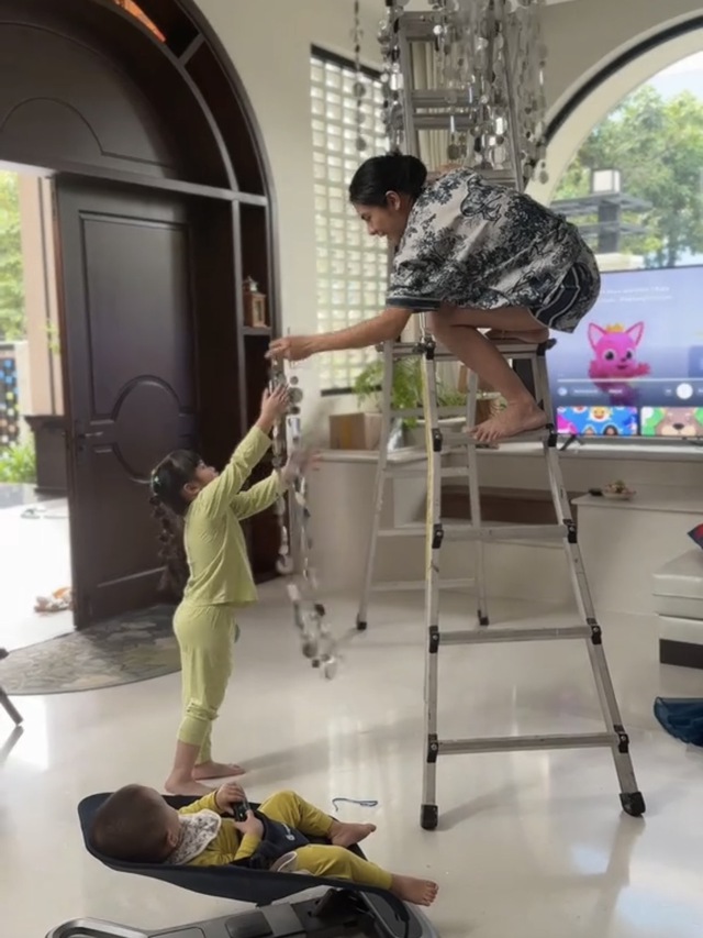 Cô được con hỗ trợ treo vật dụng. Đây là cách dạy con rất đáng học hỏi từ Vân Trang. Ảnh: PNS