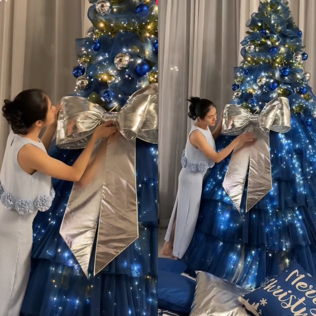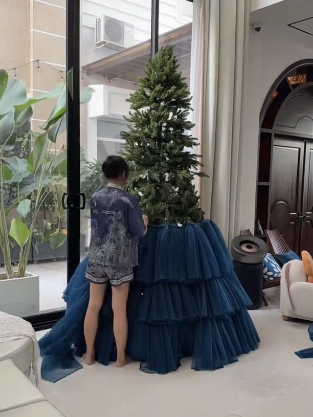 Cây thông lớn được nữ diễn viên khâu lớp vải xanh tạo độ bóng, sáng khi bật đèn. Ảnh: FCafe.