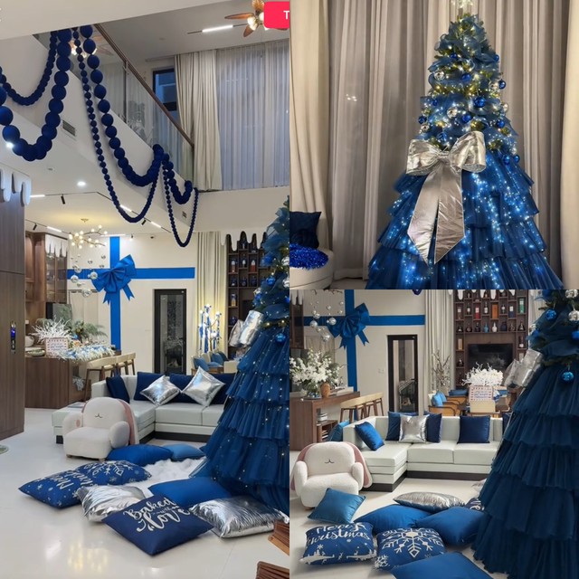 Được biết, đây là năm thứ 2 gia đình 9X đón Noel ở tổ ấm mới. Năm trước, Vân Trang chọn tông đỏ cho ngôi nhà thì năm nay quyết định “khoác” màu xanh để phù hợp với tiết trời Sài Gòn cuối năm. Tất cả các chi tiết nội thất trong gia đình đều được nữ diễn viên đổi màu và thêm nhiều món đồ điểm tô khác cho lung linh hơn. Ảnh: YanTV.