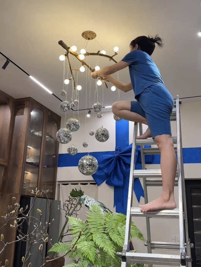 Trong không gian rộng lớn, Vân Trang tự tay trang trí, làm mọi việc để "biến hình phòng khách đậm màu Noel". Ảnh: FCafe.