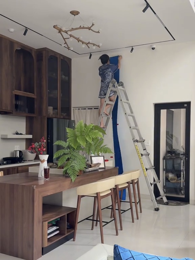 Vân Trang không ngại tự tay làm mọi việc. Từ trang trí "phủ xanh" lớp tường trắng bằng vải xanh. Ảnh: Ngôi sao.