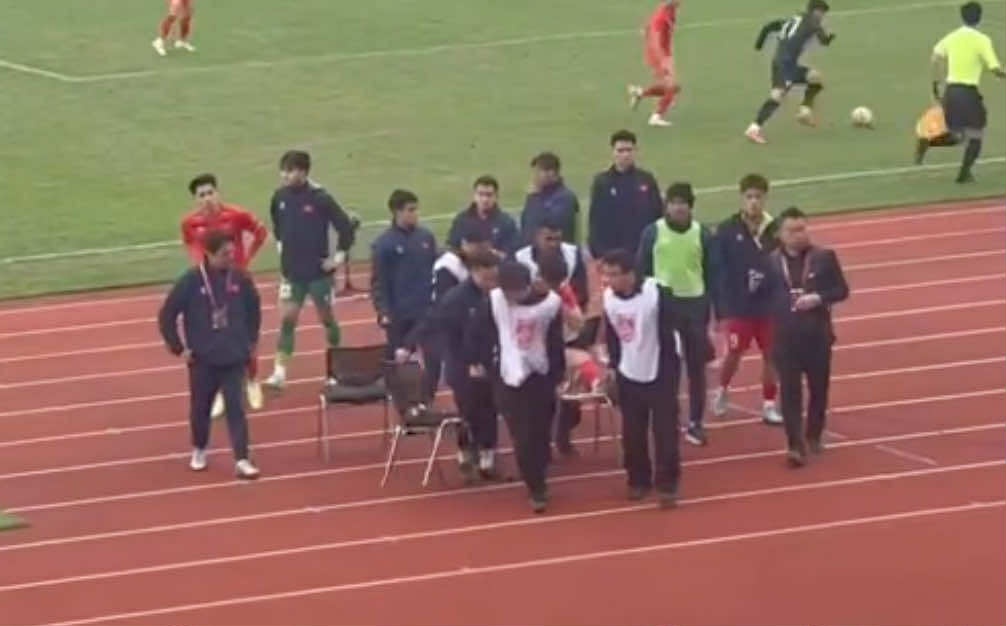 Văn Trường rời sân bằng cáng trong trận đấu của U22 Việt Nam.