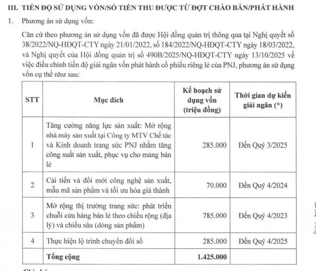 Với số tiền thu được từ đợt chào bán, PNJ đã sử dụng 285 tỷ đồng vào mục đích tăng cường năng lực sản xuất, cụ thể là mở rộng nhà máy sản xuất tại Công ty MTV Chế tác và Kinh doanh trang sức PNJ nhằm tăng công suất sản xuất, phục vụ cho mảng bán lẻ.