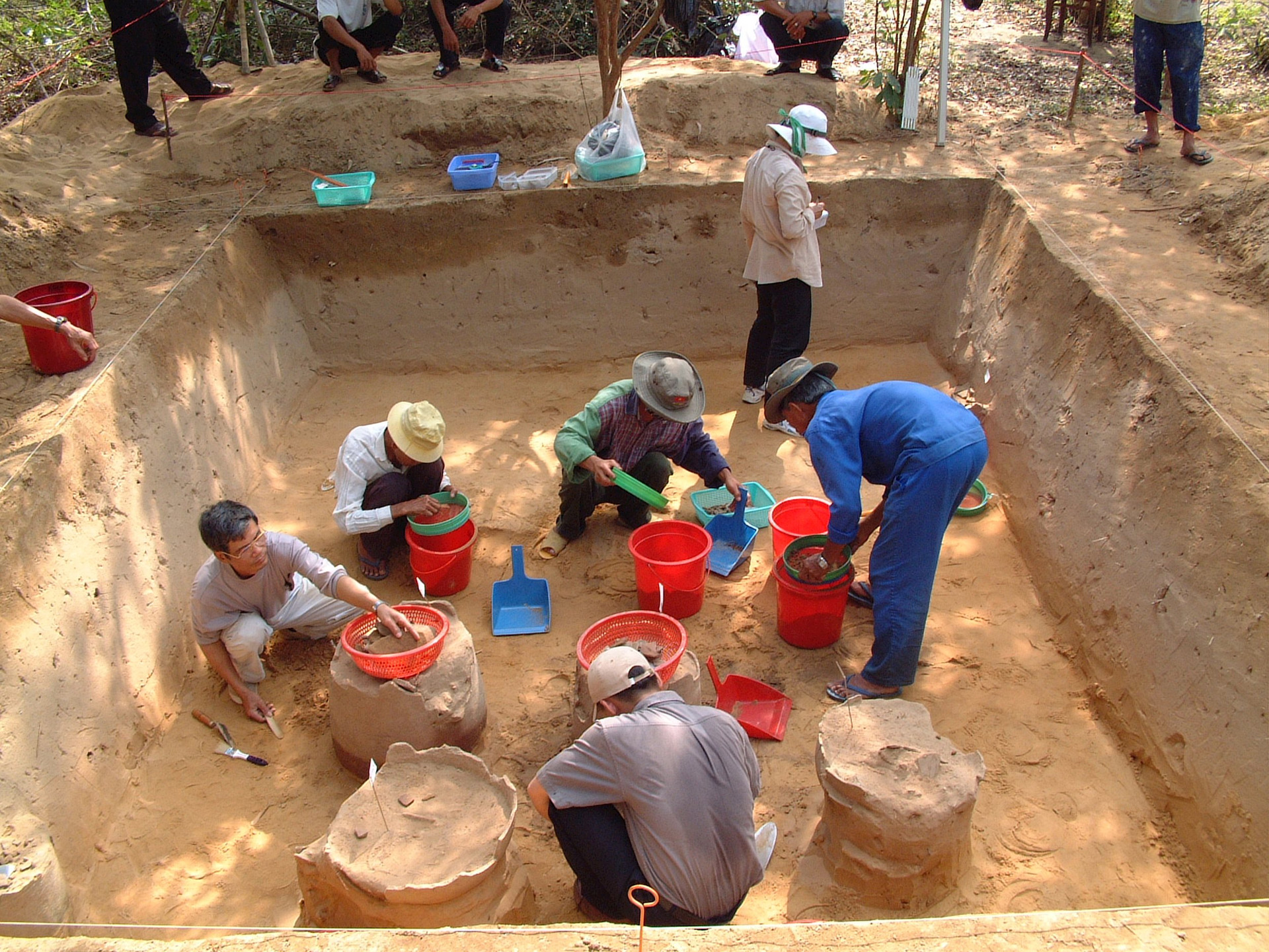 Đoàn khảo cổ dùng rây để phát hiện những hạt cườm tấm nhỏ li ti tại Lai Nghi.