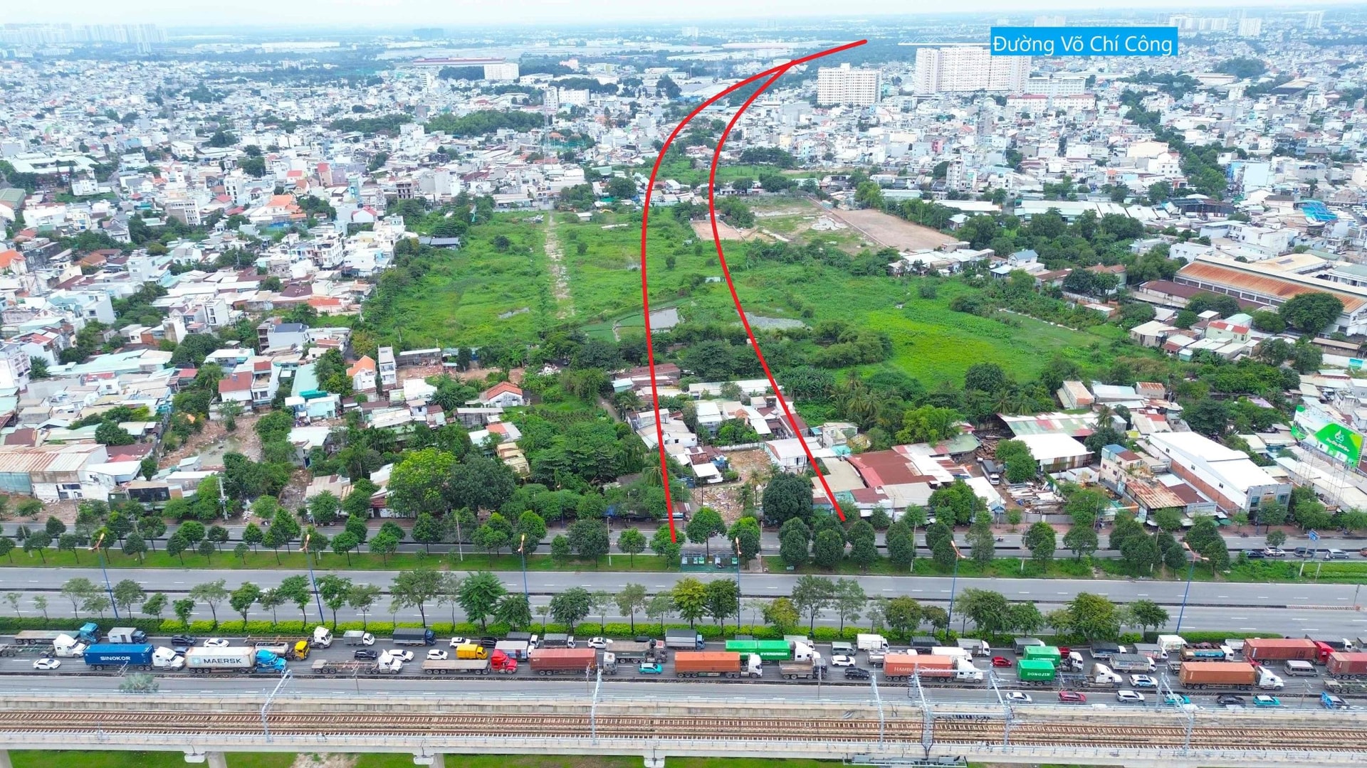 Còn nút giao Bình Thái giao với đường Võ Nguyên Giáp (trước là Xa lộ Hà Nội) có dạng hoa thị hoàn chỉnh, bao gồm cầu thép dọc tuyến Vành đai 2 vượt qua đường Võ Nguyên Giáp, kết hợp hệ thống hầm chui trên các tuyến song hành để đảm bảo lưu thông liên tục. Hiện nay, Ban Giao thông đang khẩn trương triển khai công tác lập, thẩm định và phê duyệt thiết kế bản vẽ thi công, đồng thời chuẩn bị các bước lựa chọn nhà thầu xây lắp. Dự kiến khởi công nút giao thông Bình Thái vào cuối tháng 12/2025. Trong ảnh là đường Võ Nguyên Giáp hiện nay với metro Bến Thành - Suối Tiên đi dọc tuyến.