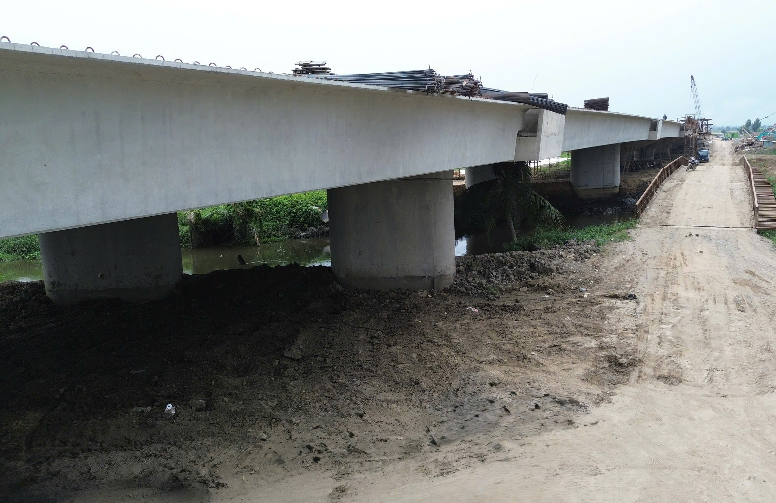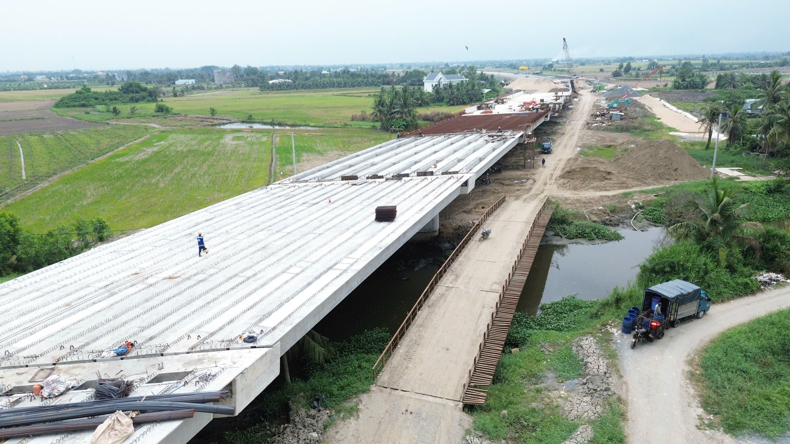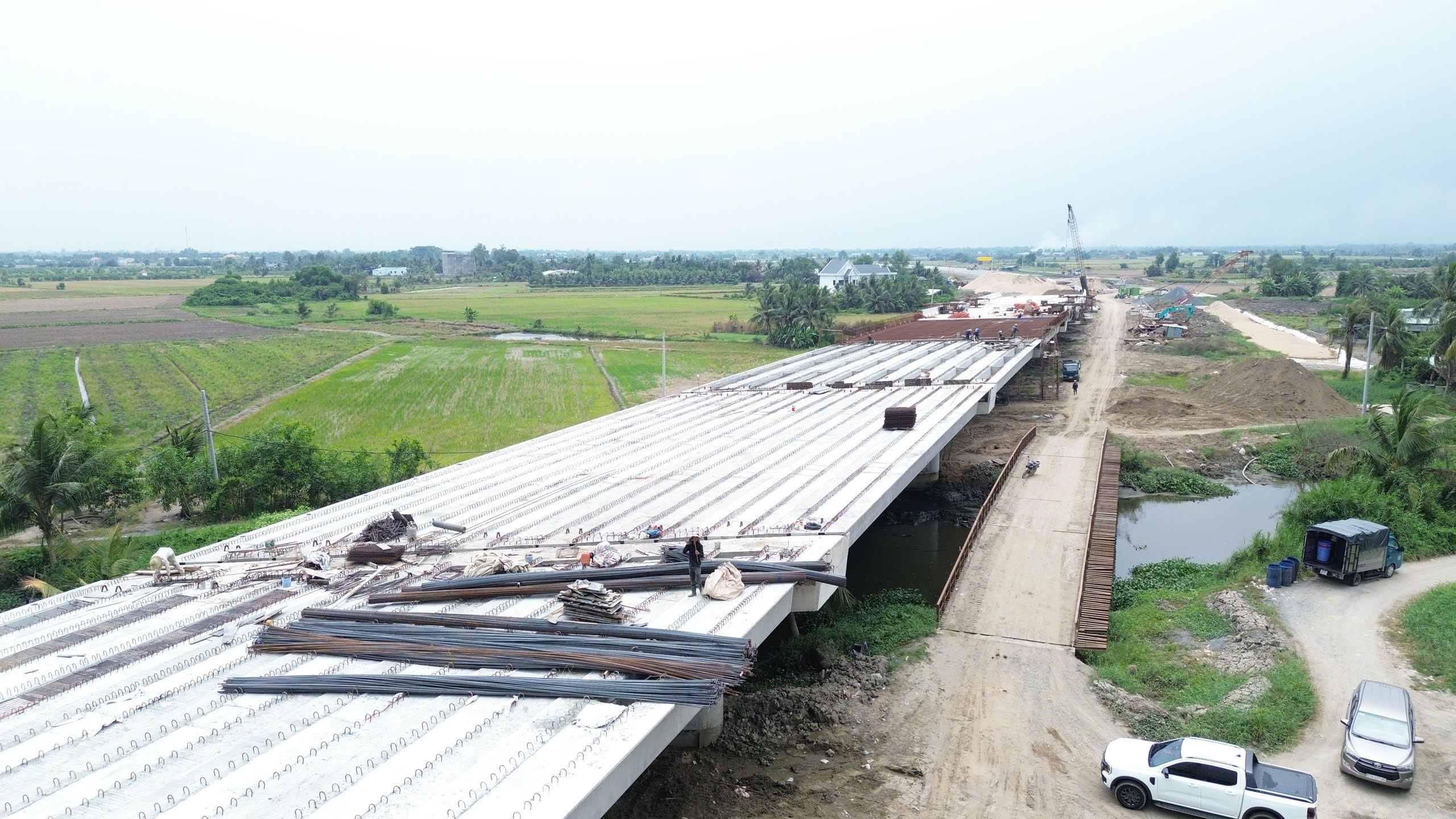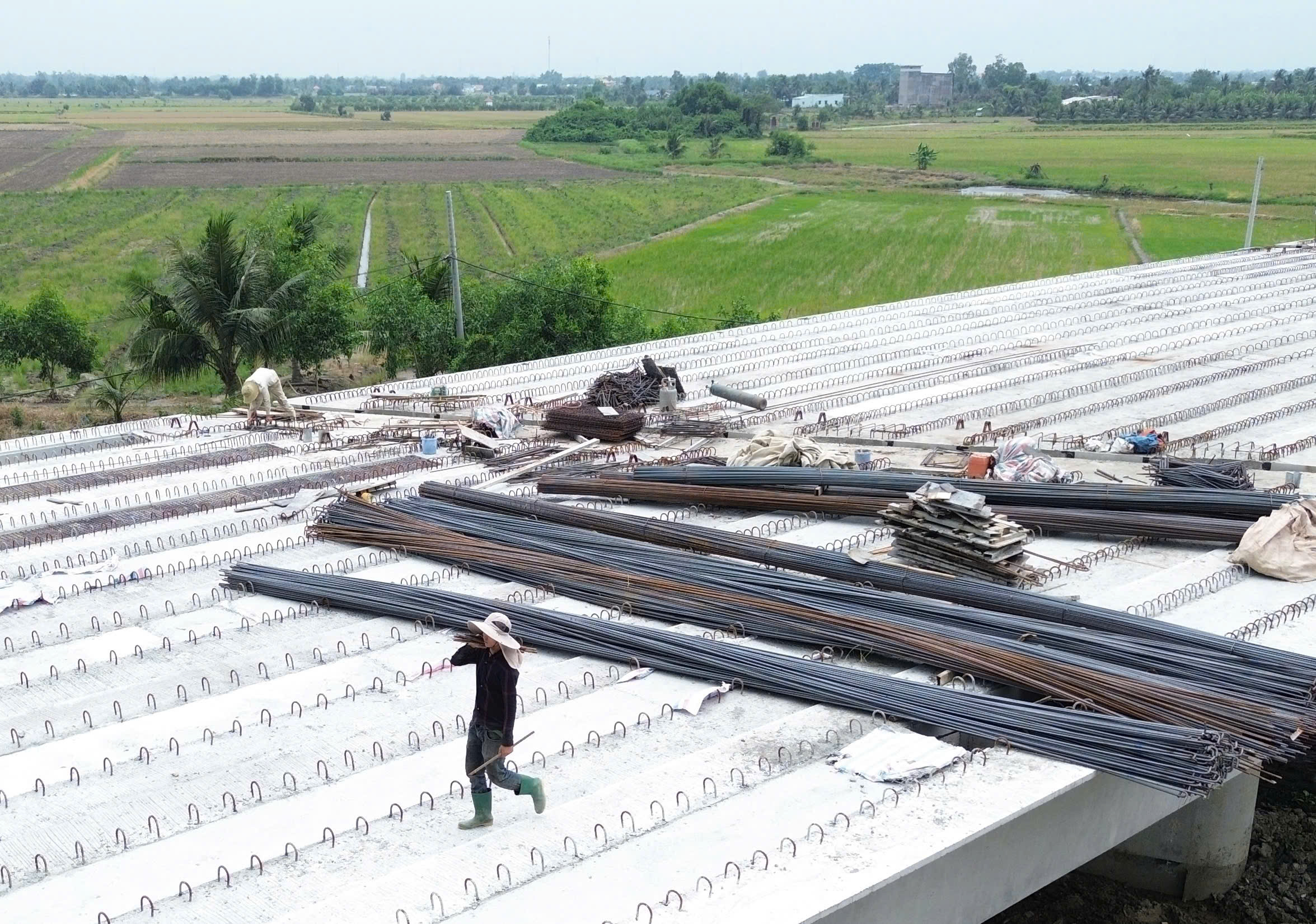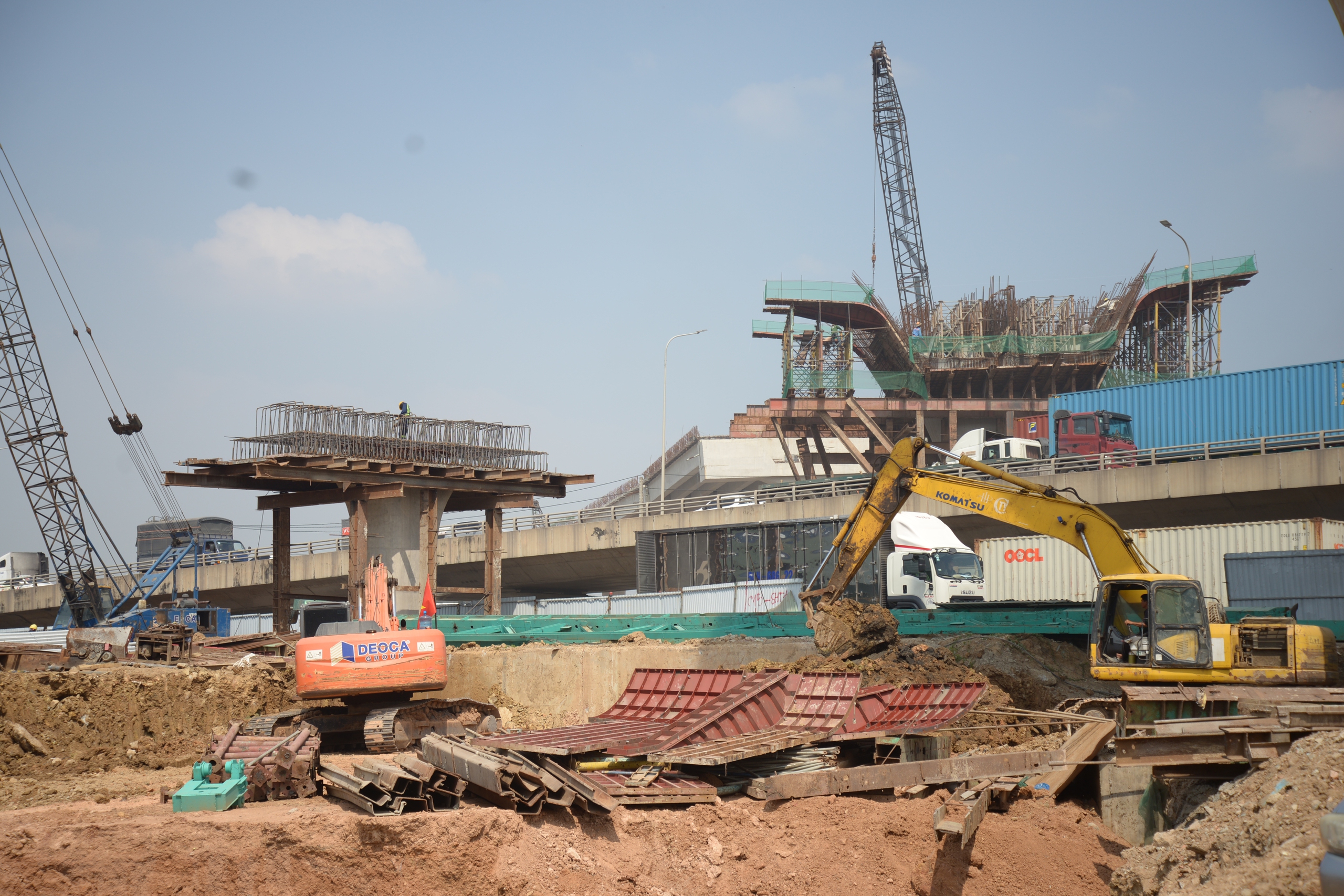 Gần khu vực nút giao Tân Vạn, tại gói thầu XL5 (Km23+550 – Km25+985), không khí thi công diễn ra khẩn trương. Hàng chục công nhân và kỹ sư tỏa ra khắp các hạng mục từ thân cầu, mặt cầu đến hệ ván khuôn và cốt thép. Công nhân chia thành nhiều nhóm: gia công, buộc thép mặt cầu; kiểm tra, căn chỉnh ván khuôn; vận chuyển vật tư, phối hợp cùng cần cẩu và máy móc hạng nặng. Các tổ, nhóm thi công làm việc liên tục theo từng mũi, tạo nên nhịp lao động khẩn trương và nhịp nhàng trên công trường.