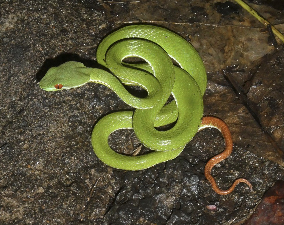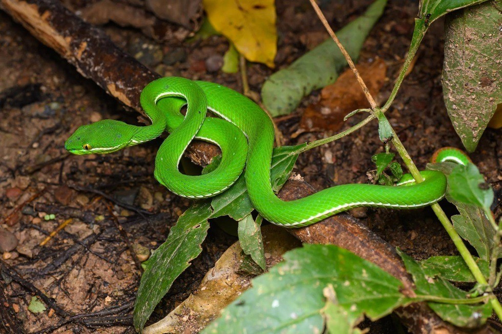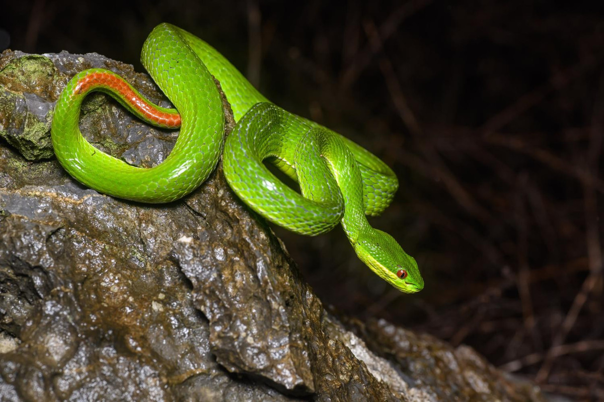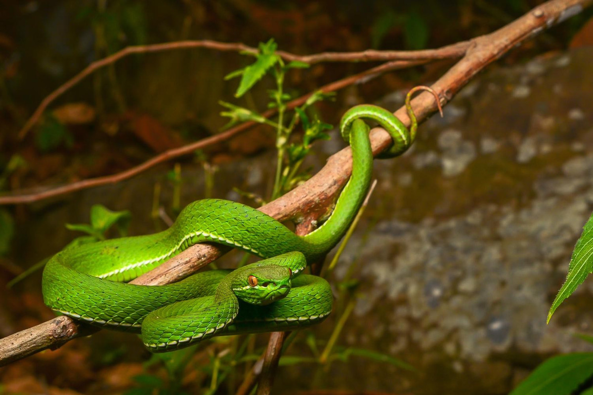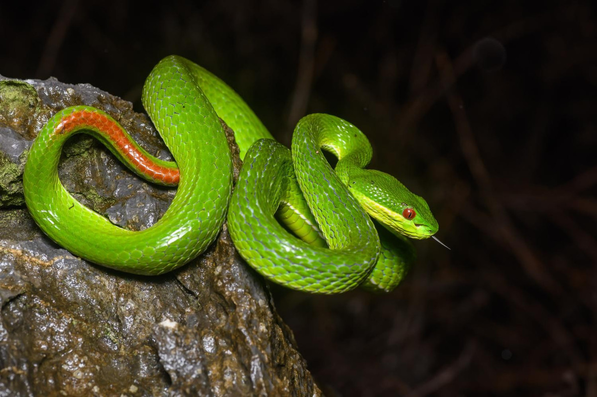 Nổi bật trong số này là loài rắn lục đuôi đỏ (tên khoa học Trimeresurus albolabris), rắn lục mắt hồng ngọc (Trimeresurus rubeus), rắn lục xanh (Trimeresurus stejnegeri) hay rắn lục mép xanh (Trimeresurus cyanolabris)… Ảnh: ThaiNationalParks.